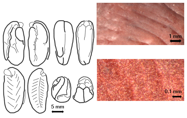 Seed: 17–20 mm long; 8–12 mm wide; 7–9 mm thick; not overgrown; not angular; symmetrical; elliptic to oblong, or ovate (slightly); compressed; with surface smooth; without visible radicle and cotyledon lobes; without hilar sinus; without umbo on seed faces; without medial ridge on each face. Cuticle not exfoliating; not inflated; not wrinkled. Testa present; with pieces of adhering epicarp; completely adhering to endocarp; free from endocarp; dull; not modified by a bloom; colored; streaked; with frequent streaks; reddish to dark brown, or red (Du Puy, 2002); with brown overlay; glabrous; not smooth; with recessed features; faintly grooved, or striate; coriaceous. Pleurogram absent. Pseudopleurogram absent. Fracture lines absent. Rim absent. Wing(s) absent. Raphe visible (11–15 mm long); from hilum through lens to base of seed and terminating; not bifurcating; lighter than testa; reddish brown; recessed. Hilum present; visible; with faboid split; with the lips of the faboid split the same color as the rest of the hilum; larger than punctiform; 1.5–2 mm long; with curved outline; elliptic; recessed; within halo; halo lighter than testa. Lens not discernible. Endosperm present; thick; not pluglike and not resembling tip of radicle; covering at least 1/2 of embryo, but not entire embryo; adnate to testa. Cotyledons not smooth; 1–3 grooves on each face to 4–6 grooves on each face (longitudinally); outer face of one cotyledon flat and other cotyledon concave (partially folded cotyledon with face flat in center and fully folded cotyledon convex in center due to folding); both the same thickness; both more or less of equal length; with both folded; sufficiently folded for inner face to touch itself and not sufficiently folded for inner face to touch itself (1 cotyledon partially folded and the other fully folded with edges touching in center); portions of inner folded face equal and unequal (fully folded cotyledon with edges touching and equal and other partially folded without edgse touching and equal); margin entire 180 degrees from base of radicle; similar at apex; partially concealing radicle; notched at radicle; with lobes; with lobes touching (auriculate); with basal groin formed by lobes; with the interface division terminating at base of radicle; without margins recessed; white; inner face with central ridge on 1 and central groove on other (fully folded cotyledon with longitudinal central ridge and the partially folded one with longitudinal central groove); glabrous on inner face. Embryonic axis straight; oblique to length of seed; without a joint evident between the radicle and the cotyledons. Radicle differentiated from cotyledon; bulbose; lobe tip straight; straight with embryonic axis; centered between cotyledons; less than 1/2 length of cotyledons. Plumule moderately developed; glabrous.
