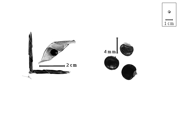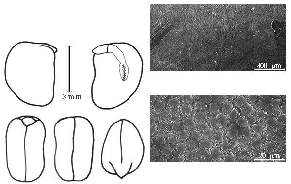 Seed: 5–5.5 mm long; 4–4.5 mm wide; 2.4–3 mm thick; not overgrown; not angular, or angular; symmetrical; reniform, or elliptic, or circular, or quadrangular; compressed; with surface smooth; without visible radicle and cotyledon lobes; without hilar sinus; without umbo on seed faces; without medial ridge on each face. Cuticle not exfoliating; not inflated; not wrinkled. Testa present; without pieces of adhering epicarp; not adhering to endocarp; free from endocarp; dull; not modified by a bloom; colored; mottled; with frequent mottles; reddish brown; with black overlay and brown overlay; glabrous; smooth; coriaceous. Pleurogram absent. Pseudopleurogram absent. Fracture lines absent. Rim absent. Wing(s) absent. Raphe not visible. Hilum present; partially concealed, or fully concealed; concealed by aril; with faboid split; with the lips of the faboid split the same color as the rest of the hilum; larger than punctiform; 2.5–3.5 mm long; with curved outline; elliptic; apical according to radicle tip but marginal according to seed length; flush; within rim, or not within corona, halo, or rim; rim color darker than testa. Lens discernible; 0.5–0.7 mm long; with margins curved; circular; not in groove of raphe; confluent with hilum; mounded; similar color as testa; darker than testa; dark brown; within halo; halo color darker than testa. Endosperm absent. Cotyledons smooth; both outer faces convex; both the same thickness; both more or less of equal length; not folded; margin entire 180 degrees from base of radicle; similar at apex; partially concealing radicle; notched at radicle; without lobes; with the interface division terminating at base of radicle; without margins recessed; white to tan; inner face flat; glabrous on inner face. Embryonic axis right angled; perpendicular to length of seed; without a joint evident between the radicle and the cotyledons. Radicle differentiated from cotyledon; linear to triangular; lobe tip straight; deflexed and parallel to cotyledon width; centered between cotyledons; less than 1/2 length of cotyledons. Plumule well developed; glabrous.