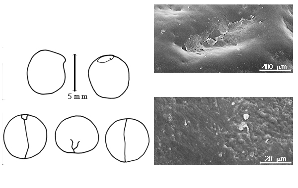 Seed: 6.5–7.5 mm long; 5–6.3 mm wide; 4.5–6 mm thick; not overgrown; not angular; symmetrical; elliptic, or ovate; terete; with surface smooth; without visible radicle and cotyledon lobes; with shallow hilar sinus; without umbo on seed faces; without medial ridge on each face. Cuticle not exfoliating; not inflated; not wrinkled. Testa present; without pieces of adhering epicarp; not adhering to endocarp; free from endocarp; glaucous; modified by a bloom; colored; monochrome; black to brown (dark); glabrous; smooth; coriaceous. Pleurogram absent. Pseudopleurogram absent. Fracture lines absent. Rim absent. Wing(s) absent. Raphe visible, or not visible; from hilum to near base of seed and terminating; not bifurcating; color of testa, or lighter than testa; black, or brown; recessed. Hilum present; partially concealed; concealed by aril; with faboid split; with the lips of the faboid split the same color as the rest of the hilum; larger than punctiform; 1–2.2 mm long; with curved outline; elliptic; marginal according to radicle tip; recessed; within rim; rim color of testa, or darker than testa. Lens discernible; 0.5–1 mm long; with margins straight; linear; not in groove of raphe; confluent with hilum; flush; same color as testa; black, or brown; within corona, or not within corona, halo, or rim; corona color darker than testa. Endosperm present; thin, or trace; not pluglike and not resembling tip of radicle; covering entire embryo, or restricted to region of embryo; adnate to testa, or embryo. Cotyledons smooth; both outer faces convex; both the same thickness; both more or less of equal length; not folded; margin entire 180 degrees from base of radicle; similar at apex; partially concealing radicle; split over radicle; without lobes; with the interface division terminating at base of radicle; with margin(s) recessed; with 1 margin recessed; recessed on same side as radicle; white, or tan; inner face concave; glabrous on inner face. Embryonic axis right angled; perpendicular to length of seed; without a joint evident between the radicle and the cotyledons. Radicle differentiated from cotyledon; triangular; lobe tip curved; oblique to cotyledons; centered between cotyledons; less than 1/2 length of cotyledons. Plumule rudimentary; glabrous.