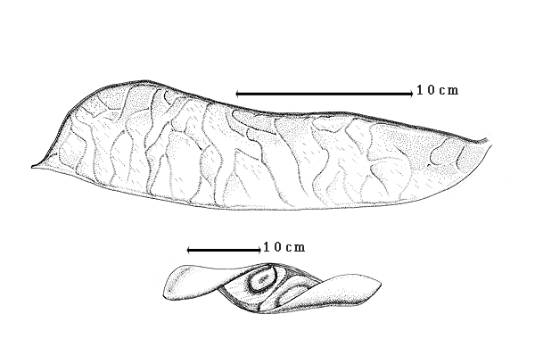 Fruit: A legume; unilocular; 26–27 cm long; 4–6 cm wide; 0.8–1 cm thick; 2–9 times longer than wide; with deciduous androecial sheath; with deciduous corolla; with deciduous calyx; without orifice formed by curving of fruit or fruit segments; straight; not plicate; not twisted; symmetrical, or asymmetrical; with 1 straight and 1 curved suture; widest near apex ("to scimitar-shaped" with edited comment "no value"); not inflated; flattened; without beak; dorsal suture short long tapered at apex; oblique with longitudinal axis of fruit (slightly); tapered at base; oblique with longitudinal axis of fruit; with the apex and base uniform in texture; ligneous; seed chambers externally invisible; margin not constricted; margin without sulcus; margin plain; wing(s) absent; not stated; tardily with all layers dehiscing; splitting along suture(s). Dehiscence of valves along both sutures; active; with valves separately enrolling. Replum invisible. Epicarp dull; monochrome; brown; with surface texture uniform; glabrous; eglandular; without spines; not smooth; with elevated features; when young veined; reticulately veined; not tuberculate; lenticular (becoming smooth with numerous narrowly elliptic lenticels); not exfoliating; without cracks; without embedded tissue, much thicker than epicarp, running from base to apex. Mesocarp present; surface not veined; 2-layered; without balsamic vesicles; with fibers; without reniform canals; with fibers spongy tissue with transverse over solid layer; ligneous. Endocarp present; visible; dull; opaque; monochrome; brown; without adhering pieces of testa; nonseptate; not exfoliating; remaining fused to mesocarp and epicarp; entire. Seed(s) 3–5; length oblique to fruit length; neither overlapping nor touching; in 1 series. Funiculus 0.1–3 mm long; of 1 length only; thick; straight. Aril absent.