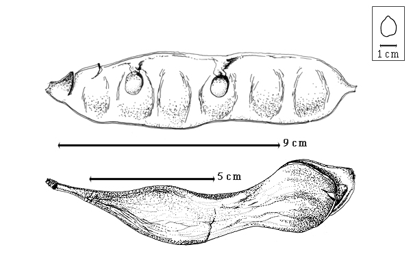 Fruit: A legume; unilocular; 5–20(–30) cm long; 2–5.5 cm wide; 0.4–1 cm thick; 2–9 times longer than wide; with deciduous androecial sheath; with deciduous corolla; with deciduous calyx; without orifice formed by curving of fruit or fruit segments; straight to curved; not plicate; not twisted; asymmetrical; nearly elliptic, or oblong; not inflated; flattened to compressed; without beak; long tapered at apex to tapered at apex; aligned with longitudinal axis of fruit; tapered at base to short tapered at base; aligned with longitudinal axis of fruit; with the apex and base uniform in texture; coriaceous, or chartaceous; seed chambers externally faintly visible; margin constricted, or not constricted; margin constricted along both margins to slightly constricted along both margins; margin without sulcus; margin plain; wing(s) absent; stipitate to substipitate; with the stipe 6–25 mm long; with all layers dehiscing; splitting along suture(s). Dehiscence of valves along both sutures; passive. Replum invisible. Epicarp dull; multicolored; mottled; brown; with black overlay; with surface texture uniform; glabrous, or pubescent and indurate; with hairs erect; with simple hairs (scattered); eglandular; without spines; not smooth; with elevated features; veined; reticulately veined; not tuberculate; not exfoliating; without cracks; without embedded tissue, much thicker than epicarp, running from base to apex. Mesocarp present; surface not veined; 1-layered; without balsamic vesicles; without fibers; without reniform canals; solid; ligneous. Endocarp present; visible; dull to glossy; opaque; monochrome; reddish brown to tan, or gray; without adhering pieces of testa; nonseptate; not exfoliating; remaining fused to mesocarp and epicarp; entire. Seed(s) 1- 2–11; length transverse to fruit length; neither overlapping nor touching; in 1 series. Funiculus 0.1–9.7 mm long; of 1 length only; flattened to thick; curved, or plicate. Aril absent.
