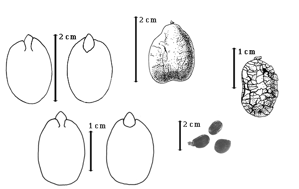 Seed: 8.5–23 mm long; 8–15(–20) mm wide; 1–8 mm thick; not overgrown; not angular; symmetrical; circular to oblong, or cordate; compressed to flattened; with surface smooth; without visible radicle and cotyledon lobes; without hilar sinus; without umbo on seed faces; without medial ridge on each face. Cuticle not exfoliating; not inflated; not wrinkled. Testa present; without pieces of adhering epicarp; not adhering to endocarp; free from endocarp; glossy, or dull; not modified by a bloom; colored; monochrome; reddish brown; glabrous; smooth, or not smooth; with elevated features; pustulate; osseous. Pleurogram absent. Pseudopleurogram absent. Fracture lines present; reticulate. Rim absent. Wing(s) absent. Raphe visible, or not visible. Hilum present; fully concealed; concealed by funicular remnant; without faboid split; larger than punctiform; 0.1–2 mm long; with curved outline; elliptic; apical at apex of radicle tip; flush; not within corona, halo, or rim. Lens discernible, or not discernible; 0.1–1 mm long; with margins curved; elliptic; not in groove of raphe; recessed; dissimilar color from testa; not within corona, halo, or rim. Endosperm present; thick to thin; not pluglike and not resembling tip of radicle; adnate to testa. Cotyledons smooth; both outer faces convex; both the same thickness; both more or less of equal length; not folded; margin entire 180 degrees from base of radicle; similar at apex; partially concealing radicle (only basal margins concealed); with lobes; with lobes not touching; with the interface division terminating at base of radicle; without margins recessed; inner face flat; glabrous on inner face. Embryonic axis straight; parallel to length of seed; without a joint evident between the radicle and the cotyledons. Radicle differentiated from cotyledon; centered between cotyledons. Plumule rudimentary; glabrous.