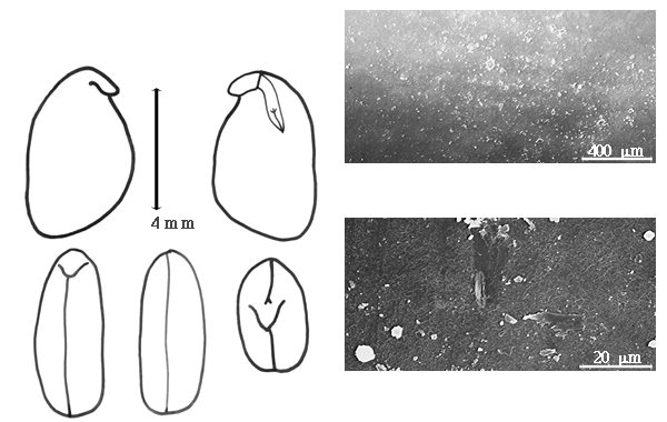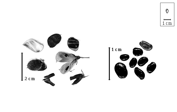 Seed: 4.5–8.5 mm long; 2.7–5.5 mm wide; 2–3.5 mm thick; not overgrown; not angular; symmetrical, or asymmetrical; oblong, or elliptic, or quadrangular (rarely); compressed to terete (nearly); with surface smooth; without visible radicle and cotyledon lobes; without hilar sinus; without umbo on seed faces; without medial ridge on each face. Cuticle not exfoliating; not inflated; not wrinkled. Testa present; without pieces of adhering epicarp; not adhering to endocarp; free from endocarp; glossy; not modified by a bloom; colored; monochrome, or mottled; with frequent mottles; black, or brown (reddish); with brown overlay; glabrous; smooth; coriaceous. Pleurogram absent. Pseudopleurogram absent. Fracture lines absent. Rim absent. Wing(s) absent. Raphe not visible. Hilum present; fully concealed to partially concealed; concealed by aril; with faboid split; larger than punctiform; 4–6.2 mm long; with straight outline; linear; apical according to radicle tip but marginal according to seed length; raised to flush; within rim; rim color darker than testa, or lighter than testa. Lens discernible; 0.5 mm long; with margins curved; punctiform; not in groove of raphe; confluent with hilum; mounded; similar color as testa; lighter than testa, or darker than testa; light brown; within rim; rim color darker than testa. Endosperm present, or absent; trace; not pluglike and not resembling tip of radicle; restricted to region of embryo; adnate to testa. Cotyledons smooth; both outer faces convex; both the same thickness; both more or less of equal length; not folded; margin entire 180 degrees from base of radicle; similar at apex; partially concealing radicle; notched at radicle; without lobes; with the interface division terminating at base of radicle; without margins recessed; white; inner face flat; glabrous on inner face. Embryonic axis oblique, or right angled; oblique to length of seed, or perpendicular to length of seed; without a joint evident between the radicle and the cotyledons. Radicle differentiated from cotyledon; bulbose to triangular; lobe tip straight to curved; deflexed and parallel to cotyledon length, or deflexed and parallel to cotyledon width, or oblique to cotyledons; centered between cotyledons; less than 1/2 length of cotyledons. Plumule moderately developed to well developed; glabrous.