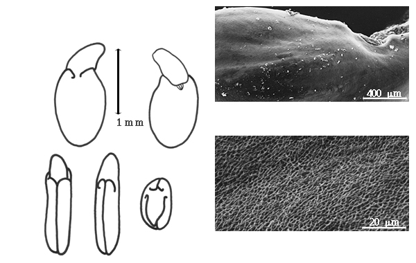 Seed: 3.2–3.4 mm long; 1.6–1.7 mm wide; 0.9–1.1 mm thick; not overgrown; not angular; asymmetrical; oblong, or reniform, or falcate; compressed to flattened; with visible radicle and cotyledon lobes; without external groove between radicle and cotyledon lobes; without hilar sinus; without umbo on seed faces; without medial ridge on each face. Cuticle not exfoliating; not inflated; not wrinkled. Testa present; without pieces of adhering epicarp; not adhering to endocarp; free from endocarp; glossy; not modified by a bloom; colored; monochrome; brown (olive to light or reddish), or olive, or tan; glabrous; smooth; chartaceous. Pleurogram absent. Pseudopleurogram absent. Fracture lines absent. Rim present. Raphe visible, or not visible (E. orthocarpa (A. Gray) S. Watson); from hilum through lens to base of seed and terminating; not bifurcating; darker than testa; black; raised. Hilum present; visible; with faboid split; with the lips of the faboid split the same color as the rest of the hilum; punctiform; marginal according to radicle tip (near apex); flush; within rim; rim color of testa (difficult to find). Lens discernible, or not discernible (E. parvifolia T.S. Brandegee); with margins curved; elliptic; not in groove of raphe; adjacent to hilum; 0.2 mm from hilum; mounded; similar color as testa; darker than testa (barely); black; not within corona, halo, or rim. Endosperm present; thin; not pluglike and not resembling tip of radicle; covering entire embryo; adnate to testa. Cotyledons smooth; both outer faces convex; both the same thickness; both more or less of equal length; not folded; margin entire 180 degrees from base of radicle; similar at apex; partially concealing radicle (almost exposed); split over radicle; with lobes; with lobes not touching; with the interface division terminating at base of radicle; without margins recessed; tan; inner face flat; glabrous on inner face. Embryonic axis deflexed (to almost straight in E. parvifolia T.S. Brandegee); oblique to length of seed; without a joint evident between the radicle and the cotyledons. Radicle differentiated from cotyledon; bulbose; lobe tip curved; deflexed and parallel to cotyledon width; centered between cotyledons; less than 1/2 length of cotyledons. Plumule rudimentary, or moderately developed; glabrous.
