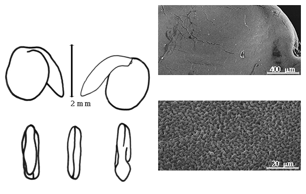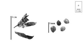 Seed: 3.7 mm long; 3 mm wide; 1.5 mm thick; not overgrown; not angular; asymmetrical; oblong, or triangular; compressed; with surface smooth; with visible radicle and cotyledon lobes; without external groove between radicle and cotyledon lobes; without hilar sinus; without umbo on seed faces; without medial ridge on each face. Cuticle not exfoliating; not inflated; not wrinkled. Testa present; without pieces of adhering epicarp; not adhering to endocarp; free from endocarp; glossy; not modified by a bloom; colored; monochrome; dark reddish to greenish brown, or olive; glabrous; smooth; coriaceous. Pleurogram absent. Pseudopleurogram absent. Fracture lines absent. Rim absent. Wing(s) absent. Raphe not visible. Hilum present; visible; with faboid split; with the lips of the faboid split the same color as the rest of the hilum; punctiform; subapical to radicle tip and between cotyledon and radicle lobe; recessed; within halo; halo darker than testa (greenish). Lens discernible; with margins straight, or curved; oblong, or linear; oblong; not in groove of raphe; confluent with hilum; flush; dissimilar color from testa; lighter than testa; tan; not within corona, halo, or rim. Endosperm present; thick; not pluglike and not resembling tip of radicle; covering entire embryo; adnate to embryo. Cotyledons smooth; both outer faces convex; both the same thickness; both more or less of equal length; not folded; margin entire 180 degrees from base of radicle; similar at apex; not concealing radicle; split over radicle; with lobes; with the interface division terminating at base of radicle; without margins recessed; reddish brown; inner face flat; glabrous on inner face. Embryonic axis deflexed; oblique to length of seed; without a joint evident between the radicle and the cotyledons. Radicle differentiated from cotyledon; bulbose; lobe tip straight; deflexed and parallel to cotyledon length; not centered between cotyledons (radicle outside 1 cotyledon and inside other, therefore junctions for each cotyledon different); equaling length of cotyledons. Plumule rudimentary; glabrous.