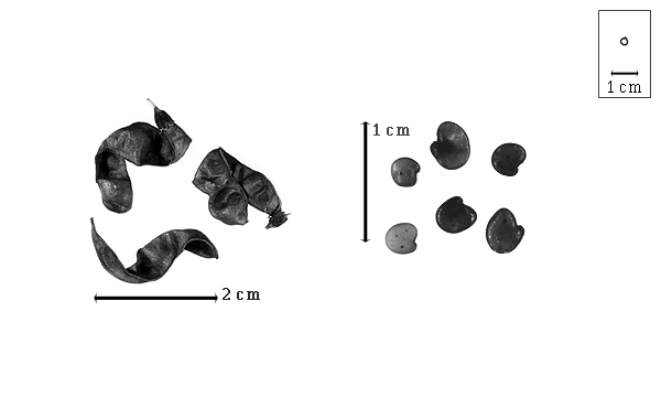 Fruit: A legume (apparently breaking between seed chambers (like a loment)); unilocular; 3 cm long; 0.6–0.7 cm wide; 0.2 cm thick; 2–9 times longer than wide; with deciduous androecial sheath; with deciduous corolla; with deciduous calyx; without orifice formed by curving of fruit or fruit segments; slightly curved; plicate (loosely), or not plicate; not twisted; asymmetrical, or symmetrical; linear; with both sutures nearly straight; not inflated; compressed; without beak; short tapered at apex, or rounded at apex; aligned with longitudinal axis of fruit; short tapered at base, or rounded at base; aligned with longitudinal axis of fruit; with the apex and base uniform in texture; coriaceous; seed chambers externally visible; seed chambers with the raised seed chambers torulose; margin constricted; margin constricted along both margins; margin without sulcus; margin plain; wing(s) absent; nonstipitate; indehiscent (probably). Replum visible ("articles" falling free from replum). Epicarp dull; monochrome; reddish brown; with surface texture uniform; glabrous; eglandular; without spines; not smooth; with elevated features; veined; reticulately veined; not tuberculate; not exfoliating; without cracks; without embedded tissue, much thicker than epicarp, running from base to apex. Mesocarp present; thin; surface not veined; 1-layered; without balsamic vesicles; without fibers; without reniform canals; solid; coriaceous. Endocarp present; visible; dull; opaque; monochrome; tan; smooth; without adhering pieces of testa; nonseptate (seed fits into fruit like a ball in a socket and walls of fruit form pseudosepta); chartaceous; not exfoliating; remaining fused to mesocarp and epicarp; without wings; entire. Seed(s) 1–4; length parallel with fruit length; neither overlapping nor touching; in 1 series. Funiculus of 1 length only; triangular; straight. Aril absent.