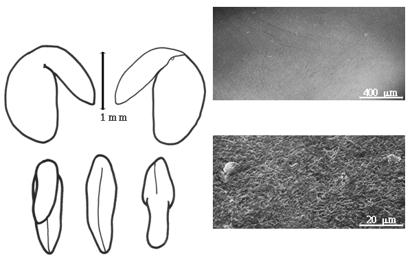 Seed: 3–3.7 mm long; 3 mm wide; 1.3–1.5 mm thick; not overgrown; not angular; asymmetrical; D-shaped, or mitaform, or rhombic; compressed; with surface smooth; with visible radicle and cotyledon lobes; without external groove between radicle and cotyledon lobes; without hilar sinus; without umbo on seed faces; without medial ridge on each face. Cuticle not exfoliating; not inflated; not wrinkled. Testa present; without pieces of adhering epicarp; not adhering to endocarp; free from endocarp; dull; not modified by a bloom; colored; monochrome; reddish brown; glabrous; smooth; coriaceous. Pleurogram absent. Pseudopleurogram absent. Fracture lines absent. Rim absent. Wing(s) absent. Raphe not visible. Hilum present; fully concealed; concealed by funicular remnant; without faboid split; punctiform; between cotyledon and radicle lobe; recessed; within halo; halo darker than testa. Lens discernible, or not discernible; with margins curved; circular; not in groove of raphe; adjacent to hilum; 0.5 mm from hilum; mounded; similar color as testa; darker than testa; reddish brown; not within corona, halo, or rim. Endosperm present; thin; not pluglike and not resembling tip of radicle; covering entire embryo; adnate to embryo. Cotyledons smooth; both outer faces convex; both the same thickness; both more or less of equal length; not folded; margin entire 180 degrees from base of radicle; similar at apex; not concealing radicle; entire over radicle; without lobes; with the interface division terminating at base of radicle; without margins recessed; tan; inner face flat; glabrous on inner face. Embryonic axis deflexed; oblique to length of seed; without a joint evident between the radicle and the cotyledons. Radicle differentiated from cotyledon; linear; lobe tip straight; deflexed and parallel to cotyledon length; centered between cotyledons; 1/2 to nearly length of cotyledons. Plumule rudimentary; glabrous.