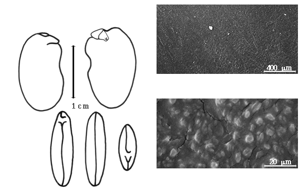 Seed: 10–23 mm long; 10–22 mm wide; 4–5 mm thick; not overgrown; not angular, or angular (in literature); symmetrical, or asymmetrical; circular, or elliptic, or irregular, or quadrangular (rarely); compressed to flattened; with surface smooth; without visible radicle and cotyledon lobes; without hilar sinus; without umbo on seed faces; without medial ridge on each face. Cuticle not exfoliating; not inflated; not wrinkled. Testa present; without pieces of adhering epicarp; not adhering to endocarp; free from endocarp; dull; not modified by a bloom; colored; monochrome, or mottled, or streaked; with infrequent mottles; with infrequent streaks; brown; with brown overlay (darker); glabrous; smooth, or not smooth; with elevated features; wrinkled; chartaceous. Pleurogram absent. Pseudopleurogram absent. Fracture lines absent, or present; irregular. Rim absent. Wing(s) absent. Raphe visible, or not visible; from hilum to near base of seed and terminating; not bifurcating; darker than testa; raised. Hilum present; partially concealed; concealed by funicular remnant; with faboid split; with the lips of the faboid split the same color as the rest of the hilum; larger than punctiform; 2–4.5 mm long; with curved outline; elliptic; apical according to radicle tip but marginal according to seed length; raised, or flush; within halo, or within rim; halo darker than testa; rim color darker than testa. Lens discernible, or not discernible; 2–4 mm long; with margins straight; linear to triangular (narrowly); not in groove of raphe; confluent with hilum; flush; same color as testa, or similar color as testa; darker than testa; not within corona, halo, or rim. Endosperm absent. Cotyledons smooth; both outer faces convex; both the same thickness; both more or less of equal length; not folded; margin entire 180 degrees from base of radicle; similar at apex; partially concealing radicle; notched at radicle; without lobes; with the interface division terminating at base of radicle; without margins recessed; brown, or tan; inner face flat; glabrous on inner face. Embryonic axis oblique; oblique to length of seed; without a joint evident between the radicle and the cotyledons. Radicle differentiated from cotyledon; bulbose; lobe tip straight; oblique to cotyledons; centered between cotyledons; less than 1/2 length of cotyledons. Plumule rudimentary, or moderately developed; glabrous.