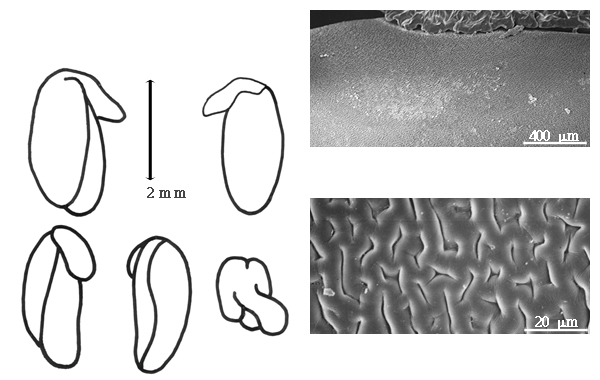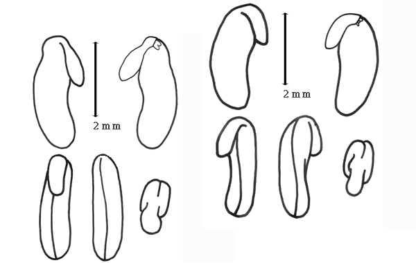 Seed: 1–5 mm long; 1.3–3 mm wide; 1–2.3 mm thick; not overgrown; angular, or not angular; asymmetrical, or symmetrical; mitaform, or oblong, or reniform to elliptic, or circular, or D-shaped; compressed; with surface smooth; with visible radicle and cotyledon lobes, or without visible radicle and cotyledon lobes; without external groove between radicle and cotyledon lobes; without hilar sinus; without umbo on seed faces; without medial ridge on each face. Cuticle not exfoliating; not inflated; not wrinkled. Testa present; without pieces of adhering epicarp; not adhering to endocarp; free from endocarp; glossy, or dull (Brachysema); not modified by a bloom; colored; monochrome, or mottled, or mottled and streaked; with frequent mottles; reddish brown, or black; with purple overlay, or brown overlay (Nemcia); glabrous; smooth, or not smooth (rarely); with elevated features; transversely ridged; coriaceous. Pleurogram absent. Pseudopleurogram absent. Fracture lines absent. Rim absent. Wing(s) absent. Raphe not visible. Hilum present; partially concealed; concealed by aril; with faboid split; with the lips of the faboid split the same color as the rest of the hilum; larger than punctiform; 0.7–1 mm long; with curved outline, or straight outline (Nemcia); oval, or circular (Brachysema); oblong (Nemcia); marginal according to radicle tip, or between cotyledon and radicle lobe (Brachysema); recessed; within rim, or not within corona, halo, or rim (Brachysema and Nemcia), or within halo (Brachysema); halo nearly of testa (Brachysema); rim color darker than testa. Lens discernible, or not discernible (Brachysema); 0.1–1 mm long; with margins straight, or curved; oblong; circular, or oblong, or key-hole shaped (Brachysema); not in groove of raphe; confluent with hilum, or adjacent to hilum; 0.1–0.2 mm from hilum; mounded, or flush; similar color as testa, or dissimilar color from testa (Brachysema and Nemcia); darker than testa; dark reddish brown or brown, or black (Nemcia); not within corona, halo, or rim. Endosperm present; thin, or thick (Brachysema); not pluglike and not resembling tip of radicle; covering entire embryo; adnate to testa, or embryo (Brachysema and Nemcia). Cotyledons smooth; both outer faces convex; both the same thickness; both more or less of equal length; not folded; margin entire 180 degrees from base of radicle; similar at apex; not concealing radicle; split over radicle, or entire over radicle (Brachysema and Nemcia); with lobes, or without lobes (Brachysema and Nemcia); with the interface division terminating at base of radicle; without margins recessed; reddish tan to tan, or brown (reddish), or yellow (Brachysema); inner face flat; glabrous on inner face. Embryonic axis deflexed; oblique to length of seed; without a joint evident between the radicle and the cotyledons. Radicle differentiated from cotyledon; linear, or bulbose (Brachysema and Nemcia); lobe tip straight (Brachysema); deflexed and parallel to cotyledon length; centered between cotyledons; less than 1/2 length of cotyledons. Plumule rudimentary, or moderately developed (Brachysema); glabrous.