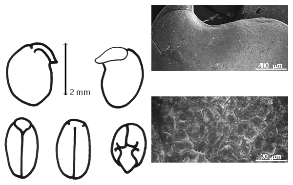 Seed: 2.2–2.8 mm long; 1.8–2.2 mm wide; 0.9–1.1 mm thick; not overgrown; not angular; asymmetrical; reniform; compressed; with visible radicle and cotyledon lobes; without external groove between radicle and cotyledon lobes; without hilar sinus; without umbo on seed faces; without medial ridge on each face. Cuticle not exfoliating; not inflated; not wrinkled. Testa present; without pieces of adhering epicarp; not adhering to endocarp; free from endocarp; dull; not modified by a bloom; colored; monochrome; reddish brown; glabrous; smooth; osseous. Pleurogram absent. Pseudopleurogram absent. Fracture lines absent. Rim absent. Wing(s) absent. Raphe visible, or not visible; from hilum to lens; not bifurcating; color of testa, or darker than testa; black (ish); recessed. Hilum present; visible; with faboid split; with the lips of the faboid split the same color as the rest of the hilum; punctiform; marginal according to radicle tip, or between cotyledon and radicle lobe; recessed; within rim, or not within corona, halo, or rim; rim color of testa. Lens discernible; 1–2 mm long; with margins curved; more or less circular; not in groove of raphe; adjacent to hilum; 2 mm from hilum; mounded; dissimilar color from testa; darker than testa; black (ish); not within corona, halo, or rim. Endosperm present; thin; not pluglike and not resembling tip of radicle; covering entire embryo; adnate to testa. Cotyledons smooth; both outer faces convex; both the same thickness; both more or less of equal length; not folded; margin entire 180 degrees from base of radicle; similar at apex; partially concealing radicle to not concealing radicle; split over radicle; with lobes; with lobes touching (auriculate); with the interface division terminating at base of radicle; without margins recessed; yellow; inner face flat; glabrous on inner face. Embryonic axis deflexed; oblique to length of seed; without a joint evident between the radicle and the cotyledons. Radicle differentiated from cotyledon; more or less bulbose; lobe tip straight; oblique to cotyledons; centered between cotyledons; less than 1/2 length of cotyledons. Plumule rudimentary; glabrous.