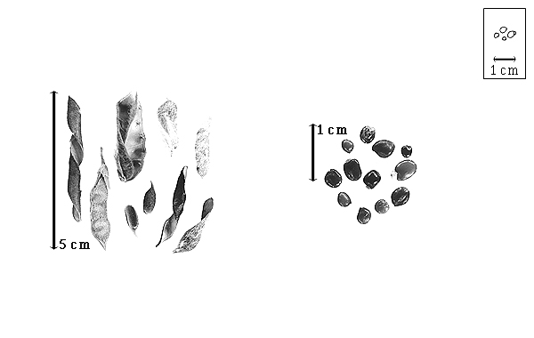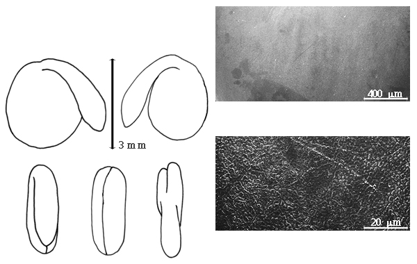 Seed: 1.8–4.2 mm long; 1.5–3 mm wide; 1–2 mm thick; not overgrown; not angular, or angular; asymmetrical; oblong, or ovate, or reniform, or circular (more or less), or D-shaped, or irregular (somewhat), or quadrangular, or rhombic, or triangular; compressed, or terete; with surface smooth; with visible radicle and cotyledon lobes, or without visible radicle and cotyledon lobes; without external groove between radicle and cotyledon lobes, or with external groove between radicle and cotyledon lobes; with external groove between radicle and cotyledon lobes same color as testa; without hilar sinus; without umbo on seed faces; without medial ridge on each face. Cuticle not exfoliating; not inflated; not wrinkled. Testa present; without pieces of adhering epicarp; not adhering to endocarp; free from endocarp; glossy; not modified by a bloom; colored; monochrome, or mottled and streaked (sometimes both faint); with frequent mottles; with frequent streaks; brown to yellowish, greenish or reddish brown, or yellow (to brownish to greenish yellow), or green, or olive, or black; with brown overlay, or black overlay; glabrous; smooth; coriaceous. Pleurogram absent. Pseudopleurogram absent. Fracture lines absent. Rim absent. Wing(s) absent. Raphe not visible. Hilum present; visible, or fully concealed (occasionally); concealed by funiculus, or funicular remnant; with faboid split; with the lips of the faboid split the same color as the rest of the hilum; punctiform, or larger than punctiform; 0.3 mm long; with curved outline; circular; apical at apex of radicle tip, or subapical to radicle tip; recessed; within rim; rim color of testa. Lens discernible, or not discernible; 0.5 mm long; with margins straight, or curved; oblong; elliptic, or oblong; not in groove of raphe; adjacent to hilum, or confluent with hilum; 0.1–0.2 mm from hilum; mounded, or flush; similar color as testa; not within corona, halo, or rim. Endosperm present; thick, or thin; not pluglike and not resembling tip of radicle; covering entire embryo; adnate to embryo, or testa. Cotyledons smooth; both outer faces convex; both the same thickness; both more or less of equal length; not folded; margin entire 180 degrees from base of radicle; similar at apex; not concealing radicle; split over radicle; with lobes; with the interface division terminating at base of radicle; without margins recessed; tan, or yellow, or white; inner face flat; glabrous on inner face. Embryonic axis deflexed; oblique to length of seed; without a joint evident between the radicle and the cotyledons. Radicle differentiated from cotyledon; linear, or bulbose; lobe tip straight; deflexed and parallel to cotyledon length; centered between cotyledons; 1/2 to nearly length of cotyledons, or equaling length of cotyledons, or exceeding length of cotyledons. Plumule rudimentary; glabrous.