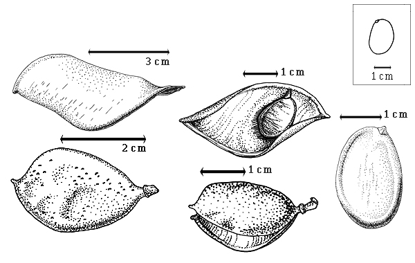 Seed: 11–23 mm long; 6.5–17 mm wide; 3–4 mm thick; not overgrown; not angular; symmetrical; oblong; compressed; with surface smooth; without visible radicle and cotyledon lobes; without hilar sinus; without umbo on seed faces; without medial ridge on each face. Cuticle not exfoliating; not inflated; not wrinkled. Testa present; without pieces of adhering epicarp; not adhering to endocarp; free from endocarp; dull; not modified by a bloom; colored; monochrome; dark reddish brown; glabrous; smooth; osseous. Pleurogram absent. Pseudopleurogram absent. Fracture lines present; transversely reticulate. Rim absent. Wing(s) absent. Raphe not visible. Hilum present; visible, or fully concealed; concealed by funicular remnant; without faboid split; larger than punctiform; 0.1–0.5 mm long; with curved outline; elliptic; subapical to radicle tip; recessed; not within corona, halo, or rim. Lens discernible; 0.1–0.5 mm long; with margins straight; linear; not in groove of raphe; mounded; similar color as testa; darker than testa; not within corona, halo, or rim. Endosperm absent. Cotyledons smooth; both outer faces convex; both the same thickness; both more or less of equal length; not folded; margin entire 180 degrees from base of radicle; similar at apex; completely concealing radicle; notched at radicle and split over radicle, or notched at radicle (only); with the interface division terminating at base of radicle; without margins recessed; inner face flat; glabrous on inner face. Embryonic axis straight; parallel to length of seed to oblique to length of seed; without a joint evident between the radicle and the cotyledons. Radicle differentiated from cotyledon; centered between cotyledons. Plumule rudimentary; glabrous.