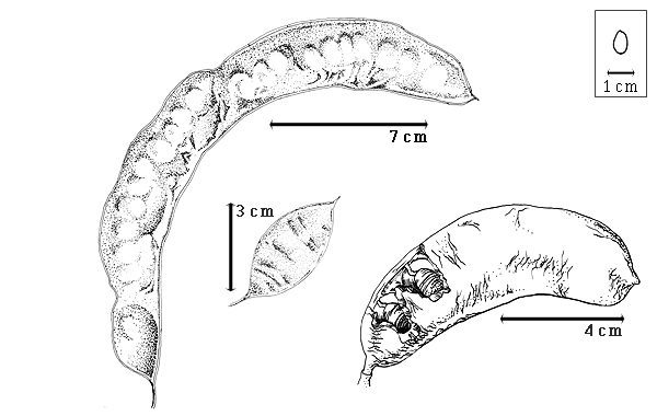 Fruit: A legume; unilocular; 2–45 cm long; 1.5–8 cm wide; 0.2–1.2 cm thick; length less than twice as long as width to more than 9 times longer than wide; with deciduous androecial sheath; with deciduous corolla; with deciduous calyx; without orifice formed by curving of fruit or fruit segments; straight to curved; not plicate; twisted, or not twisted; symmetrical, or asymmetrical; linear to lanceolate, or ovate, or elliptic to oblanceolate, or falcate; with both sutures parallelly curved; not inflated; flattened to compressed; without beak; long tapered at apex; aligned with longitudinal axis of fruit; tapered at base; aligned with longitudinal axis of fruit; with the apex and base uniform in texture; coriaceous to ligneous, or membranous (when fresh); seed chambers externally invisible, or visible; margin constricted, or not constricted; margin slightly constricted only on 1 margin; margin without sulcus; margin plain; wing(s) absent; stipitate to substipitate; with the stipe 6–20 mm long; tardily with all layers dehiscing to indehiscent; splitting along suture(s). Dehiscence of valves passive. Replum invisible. Epicarp dull and glaucous; monochrome; brown to black (reddish); with surface texture uniform; glabrous, or pubescent and indurate; with hairs erect; eglandular; without spines; not smooth; with elevated features; veined; transversely veined relative to fruit length; not tuberculate; exfoliating to not exfoliating; without cracks; without embedded tissue, much thicker than epicarp, running from base to apex. Mesocarp present, or absent; surface not veined; 1-layered, or 2-layered; without balsamic vesicles; without fibers; without reniform canals; solid; with spongy layer over solid layer; ligneous to coriaceous. Endocarp present; visible; dull; opaque; monochrome; tan; without adhering pieces of testa; subseptate to nonseptate; not exfoliating; remaining fused to mesocarp and epicarp; entire. Seed(s) 1–40; length transverse to fruit length; neither overlapping nor touching; in 1 series. Funiculus 0.01–25 mm long; of 1 length only; filiform to thick; plicate. Aril absent.