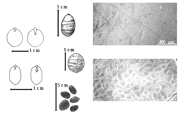 Seed: 8–17 mm long; 5–10.5 mm wide; 2–6 mm thick; not overgrown; angular, or not angular; symmetrical; ovate, or elliptic, or rectangular, or quadrangular, or circular; terete to compressed; with surface smooth; without visible radicle and cotyledon lobes; without hilar sinus; without umbo on seed faces; without medial ridge on each face. Cuticle not exfoliating; not inflated; not wrinkled. Testa present; without pieces of adhering epicarp; not adhering to endocarp; free from endocarp; glossy to dull; not modified by a bloom; colored; monochrome; brown (greenish to blackish); glabrous; smooth; osseous. Pleurogram absent. Pseudopleurogram absent. Fracture lines present; concentric. Rim absent. Wing(s) absent. Raphe not visible ("inconspicuous"). Hilum present; fully concealed; concealed by funicular remnant; without faboid split; punctiform; apical at apex of radicle tip, or subapical to radicle tip; flush; not within corona, halo, or rim. Lens discernible; 0.1–10 mm long; with margins straight, or curved; wedge-shaped; circular; not in groove of raphe; flush to recessed; same color as testa to dissimilar color from testa; black, or tan (center); not within corona, halo, or rim. Endosperm present; thick; not pluglike and not resembling tip of radicle; adnate to testa. Cotyledons smooth; both outer faces convex; both the same thickness; both more or less of equal length; not folded; margin entire 180 degrees from base of radicle; similar at apex; partially concealing radicle; with lobes; with lobes touching (auriculate), or not touching; without basal groin formed by lobes; with the interface division terminating at base of radicle; without margins recessed; inner face flat; glabrous on inner face. Embryonic axis straight; parallel to length of seed; without a joint evident between the radicle and the cotyledons. Radicle differentiated from cotyledon; centered between cotyledons. Plumule moderately developed; glabrous.