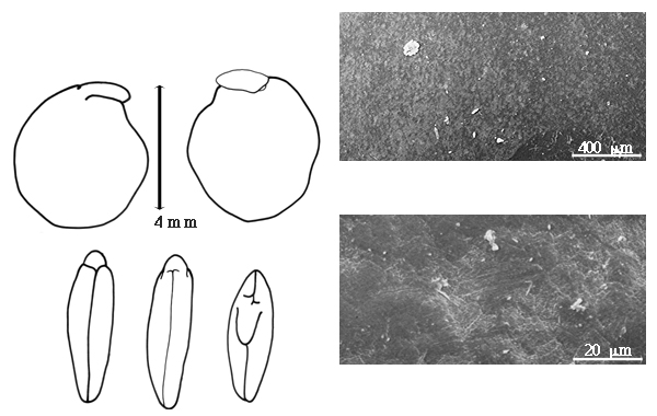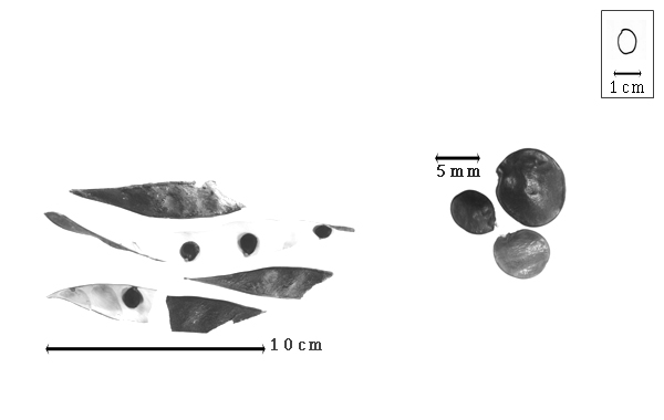 Seed: 5.5–12 mm long; 1–10 mm wide; 1.5–3 mm thick; not overgrown; not angular; nearly symmetrical, or asymmetrical; sub circular, circular, or oblong, or ovate; flattened, or compressed; with surface smooth; without visible radicle and cotyledon lobes; without hilar sinus; without umbo on seed faces; without medial ridge on each face. Cuticle not exfoliating; not inflated; not wrinkled. Testa present; without pieces of adhering epicarp; not adhering to endocarp; free from endocarp; glossy, or dull; not modified by a bloom; colored; monochrome; black, or brown (reddish); glabrous; smooth, or not smooth (G. brenningii); with elevated features; wrinkled; coriaceous. Pleurogram absent. Pseudopleurogram absent. Fracture lines absent. Rim absent. Wing(s) absent. Raphe not visible. Hilum present; visible, or fully concealed; concealed by funiculus, or funicular remnant; with faboid split; with the lips of the faboid split the same color as the rest of the hilum; larger than punctiform; 1 mm long; with straight outline; oblong; apical at apex of radicle tip; flush, or recessed (slightly, G. brenningii); not within corona, halo, or rim, or within rim; rim color of testa. Lens not discernible, or discernible; 0.1–2 mm long; with margins straight; rhombic, or wedge-shaped; not in groove of raphe; adjacent to hilum; 1–1.5 mm from hilum; mounded, or flush (G. brenningii); dissimilar color from testa, or similar color as testa; darker than testa, or lighter than testa (duller, G. brenningii); reddish brown; not within corona, halo, or rim. Endosperm present; thin; not pluglike and not resembling tip of radicle; covering entire embryo; adnate to testa, or embryo. Cotyledons smooth; both outer faces convex, or outer face of one cotyledon flat and other cotyledon convex (G. brenningii); both the same thickness; both more or less of equal length; not folded; margin entire 180 degrees from base of radicle; similar at apex; completely concealing radicle, or not concealing radicle (G. brenningii); split over radicle; with lobes; without basal groin formed by lobes; with the interface division terminating at base of radicle; without margins recessed, or with margin(s) recessed (G. brenningii); tan, or brown (reddish), or green; inner face flat; glabrous on inner face. Embryonic axis deflexed; oblique to length of seed; without a joint evident between the radicle and the cotyledons. Radicle differentiated from cotyledon; bulbose; deflexed and parallel to cotyledon width; centered between cotyledons; less than 1/2 length of cotyledons. Plumule moderately developed, or rudimentary; glabrous.