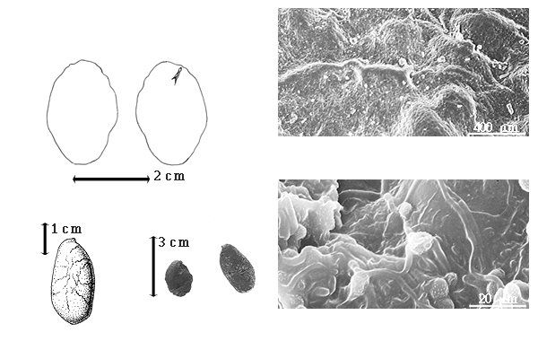 Seed: 18–30 mm long; 12–15 mm wide; 7–9 mm thick; not overgrown; not angular; symmetrical; oblong; compressed; with surface smooth; without visible radicle and cotyledon lobes; without hilar sinus; without umbo on seed faces; without medial ridge on each face. Cuticle not exfoliating; not inflated; not wrinkled. Testa present; without pieces of adhering epicarp; not adhering to endocarp; free from endocarp; dull; not modified by a bloom; colored; monochrome; black to brown; glabrous; not smooth; with elevated features; rugose; coriaceous. Pleurogram absent. Pseudopleurogram absent. Fracture lines absent. Rim absent. Wing(s) absent. Raphe not visible. Hilum present; visible; without faboid split; larger than punctiform; 0.1–1 mm long; with curved outline; elliptic; subapical to radicle tip; flush; not within corona, halo, or rim. Lens not discernible. Endosperm absent. Cotyledons smooth; both outer faces convex; both the same thickness; both more or less of equal length; not folded; margin entire 180 degrees from base of radicle; similar at apex; completely concealing radicle; entire over radicle; with the interface division terminating at base of radicle; without margins recessed; inner face flat; glabrous on inner face. Embryonic axis straight; oblique to length of seed; without a joint evident between the radicle and the cotyledons. Radicle differentiated from cotyledon; centered between cotyledons. Plumule well developed; glabrous.