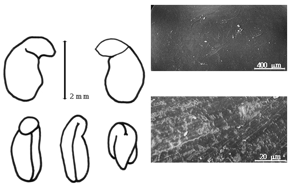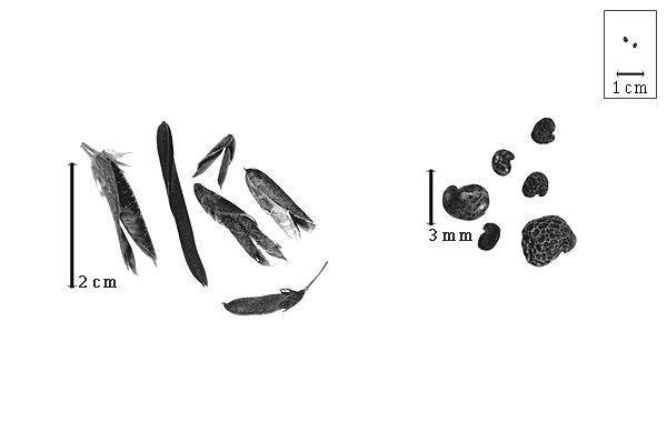 Seed: 1–1.5 mm long; 1–1.5 mm wide; 0.4–0.7 mm thick; not overgrown; not angular, or angular; asymmetrical; mitaform, or reniform, or oblong, or quadrangular (somewhat); compressed; with surface smooth; with visible radicle and cotyledon lobes; without external groove between radicle and cotyledon lobes; without hilar sinus; without umbo on seed faces; without medial ridge on each face. Cuticle not exfoliating; not inflated; not wrinkled. Testa present; without pieces of adhering epicarp; not adhering to endocarp; free from endocarp; glossy, or dull; not modified by a bloom; colored; monochrome, or mottled and streaked; greenish brown; with black overlay; glabrous; smooth, or not smooth; with elevated features, or recessed features; reticulate; pitted with small separate pits; chartaceous. Pleurogram absent. Pseudopleurogram absent. Fracture lines absent. Rim absent. Wing(s) absent. Raphe not visible. Hilum present; partially concealed; concealed by radicle lobe, or wing; with faboid split; with the lips of the faboid split the same color as the rest of the hilum; punctiform; between cotyledon and radicle lobe; flush; within halo; halo darker than testa. Lens discernible; 0.5 mm long; with margins straight, or curved; oblong; oblong; not in groove of raphe; confluent with hilum; mounded; dissimilar color from testa; darker than testa; reddish brown; within halo; halo color darker than testa. Endosperm present; thin; not pluglike and not resembling tip of radicle; covering entire embryo; adnate to embryo, or testa. Cotyledons smooth; both outer faces convex; both the same thickness; both more or less of equal length; not folded; margin entire 180 degrees from base of radicle; similar at apex; partially concealing radicle; entire over radicle; without lobes; with the interface division terminating at base of radicle; without margins recessed; tan, or white; inner face flat; glabrous on inner face. Embryonic axis deflexed; oblique to length of seed; without a joint evident between the radicle and the cotyledons. Radicle differentiated from cotyledon; bulbose; lobe tip straight, or curved; deflexed and parallel to cotyledon length; centered between cotyledons; less than 1/2 length of cotyledons. Plumule rudimentary; glabrous.