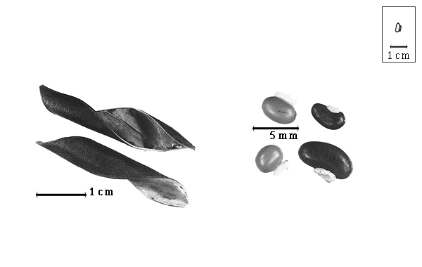 Fruit: A legume; unilocular; 3.5–4.5 cm long (from literature); 0.3–1.1 cm wide (from literature); 0.4 cm thick (from literature); 2–9 times longer than wide; with deciduous androecial sheath; with deciduous corolla; with persistent calyx; with calyx shorter than fruit; without orifice formed by curving of fruit or fruit segments; slightly curved; not plicate; not twisted; asymmetrical; nearly linear; with both sutures parallelly curved; not inflated; compressed to terete; without beak; short tapered at apex; aligned with longitudinal axis of fruit (nearly); tapered at base to short tapered at base; oblique with longitudinal axis of fruit; with the apex and base uniform in texture; coriaceous; seed chambers externally invisible; margin not constricted; margin without sulcus; margin embellished; margin with thickened sutural areas; wing(s) absent; nonstipitate; with all layers dehiscing; splitting along suture(s). Dehiscence of valves along both sutures; apical and down; active; with valves twisting. Replum invisible. Epicarp dull; monochrome; brown (to violet brown in literature); with surface texture uniform; glabrous; eglandular; without spines; not smooth; with elevated features, or recessed features; not veined; not tuberculate; minutely, obliquely rugose; slitted obliquely; not exfoliating; without cracks; without embedded tissue, much thicker than epicarp, running from base to apex. Mesocarp present; thin; surface not veined; 1-layered; without balsamic vesicles; without fibers; without reniform canals; solid; coriaceous. Endocarp present; visible; dull; opaque; monochrome; orangish brown, or tan; smooth, or cracked; without adhering pieces of testa; nonseptate; chartaceous; exfoliating in part; remaining fused to mesocarp and epicarp; without wings; entire. Seed(s) 5–6; length transverse to fruit length; neither overlapping nor touching; in 1 series. Funiculus 0.5–2 mm long; of 1 length only; flattened; triangular. Aril present; fleshy; when fleshy annular to 2-lipped rim-aril (with lips fused, but thinner in area of fusion); entire to crenate; covering less than 1/2 of seed; with tongues (or flap) on lips of 2-lipped rim-aril; with 1 tongue or flap on 1 lip of 2-lipped rim-aril, or 2 tongues or flaps, 1 on each lip of 2-lipped rim-aril.
