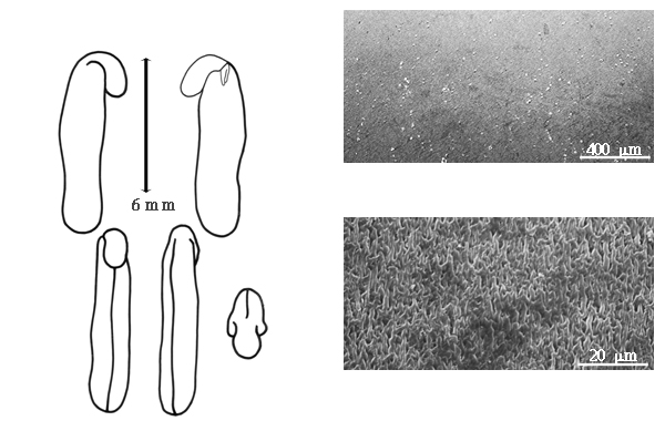 Seed: 5.5–9 mm long; 2.6–4.5 mm wide; 2.5–4 mm thick; not overgrown; not angular; asymmetrical; elliptic to rectangular; terete; with surface smooth; without visible radicle and cotyledon lobes; without hilar sinus; without umbo on seed faces; without medial ridge on each face. Cuticle not exfoliating; not inflated; not wrinkled. Testa present; without pieces of adhering epicarp; not adhering to endocarp; free from endocarp; dull; not modified by a bloom; colored; monochrome; brown; glabrous; smooth; chartaceous. Pleurogram absent. Pseudopleurogram absent. Fracture lines absent. Rim absent. Wing(s) absent. Raphe not visible. Hilum present; partially concealed; concealed by aril; with faboid split; with the lips of the faboid split the same color as the rest of the hilum; larger than punctiform; 2.5–4 mm long; with curved outline; elliptic; marginal according to radicle tip; flush; not within corona, halo, or rim. Lens discernible; 0.5–1.5 mm long; with margins straight; linear; not in groove of raphe; confluent with hilum; flush; similar color as testa; darker than testa; within halo; halo color darker than testa. Endosperm present; thick; covering entire embryo; adnate to embryo. Cotyledons not smooth; sulcate; both outer faces convex; both the same thickness; both more or less of equal length; not folded; margin entire 180 degrees from base of radicle; similar at apex; not concealing radicle; split over radicle; without lobes; with the interface division terminating at base of radicle; without margins recessed; tan; inner face flat; glabrous on inner face. Embryonic axis oblique; oblique to length of seed; without a joint evident between the radicle and the cotyledons. Radicle differentiated from cotyledon; bulbose; lobe tip curved; oblique to cotyledons; centered between cotyledons; less than 1/2 length of cotyledons. Plumule well developed; glabrous.