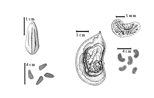 Seed: 14–22 mm long; 7–10 mm wide; 2–3 mm thick; not overgrown; not angular; symmetrical; oblong; flattened; with surface grooved (2–3 grooves on each face); longitudinal; without visible radicle and cotyledon lobes; without hilar sinus; without umbo on seed faces; without medial ridge on each face. Cuticle not exfoliating; not inflated; not wrinkled. Testa present; without pieces of adhering epicarp; not adhering to endocarp; free from endocarp; dull; not modified by a bloom; colored; monochrome; dirty tan; glabrous; not smooth; with recessed features; osseous. Pleurogram absent. Pseudopleurogram absent. Fracture lines absent. Rim absent. Wing(s) absent. Raphe not visible. Hilum present; fully concealed; concealed by funicular remnant; without faboid split; punctiform; nearly apical at apex of radicle tip; flush; not within corona, halo, or rim. Lens not discernible. Endosperm absent. Cotyledons not smooth; 1–3 grooves on each face; both outer faces convex; both the same thickness; both more or less of equal length; not folded; margin entire 180 degrees from base of radicle; similar at apex; partially concealing radicle; notched at radicle (and lobes); with lobes; with lobes not touching; with the interface division terminating at base of radicle; without margins recessed; inner face flat; glabrous on inner face. Embryonic axis straight; parallel to length of seed; without a joint evident between the radicle and the cotyledons. Radicle differentiated from cotyledon; centered between cotyledons. Plumule rudimentary; glabrous.
