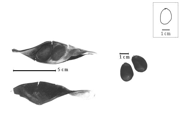 Fruit: A legume; unilocular; (9–)11–22 cm long; 2–3.7 cm wide; 1.6 cm thick (estimated); 2–9 times longer than wide; with deciduous androecial sheath; with deciduous corolla; with deciduous calyx; without orifice formed by curving of fruit or fruit segments; straight; not plicate; not twisted; symmetrical, or asymmetrical; oblong; with both sutures nearly straight; not inflated; compressed; without beak; tapered at apex; aligned with longitudinal axis of fruit; tapered at base; aligned with longitudinal axis of fruit; with the apex and base uniform in texture; ligneous; seed chambers externally invisible; margin not constricted, or constricted; margin slightly constricted along both margins; margin without sulcus; margin plain; wing(s) absent; nonstipitate, or substipitate; with all layers dehiscing; splitting along suture(s). Dehiscence of valves along both sutures; apical and down; active; with valves twisting (somewhat). Replum invisible. Epicarp glossy; monochrome (including striate); brown (dark reddish to greenish); with surface texture uniform; glabrous; eglandular; without spines; not smooth; with recessed features; not veined; not tuberculate; pitted (longitudinal and oblique); not exfoliating; with cracks; cracking oblique to fruit length; without embedded tissue, much thicker than epicarp, running from base to apex. Mesocarp present; thick; surface not veined; 1-layered; without balsamic vesicles; without fibers; without reniform canals; solid; ligneous. Endocarp present; visible; dull; opaque; monochrome; tan; below seeds smooth and scurfy (between seeds); without adhering pieces of testa; septate; with septa thicker than paper, firm; with septa eglandular; chartaceous; not exfoliating; remaining fused to mesocarp and epicarp; without wings; entire. Seed(s) 2–8; length oblique to fruit length; neither overlapping nor touching; in 1 series. Funiculus of 1 length only; triangular; straight. Aril present; dry; when dry tongue-aril; entire; tan.