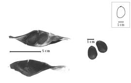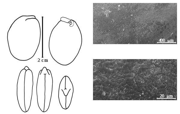 Seed: 17–20 mm long; 13–17 mm wide; 5.5–8.5 mm thick; not overgrown; not angular, or angular (somewhat); asymmetrical, or symmetrical (nearly); circular (sub), or ovate, or obovate, or triangular (more or less); compressed; with surface smooth; without visible radicle and cotyledon lobes; without hilar sinus; without umbo on seed faces; without medial ridge on each face. Cuticle not exfoliating; not inflated; not wrinkled. Testa present; without pieces of adhering epicarp; not adhering to endocarp; free from endocarp; glossy, or dull; not modified by a bloom; colored; monochrome; brown (to dark reddish brown when older); glabrous; smooth; osseous. Pleurogram absent. Pseudopleurogram absent. Fracture lines absent. Rim absent. Wing(s) absent. Raphe not visible. Hilum present; partially concealed; concealed by aril; with faboid split; with the lips of the faboid split the same color as the rest of the hilum; punctiform; apical at apex of radicle tip, or subapical to radicle tip; recessed; not within corona, halo, or rim. Lens not discernible. Endosperm present; thin; not pluglike and not resembling tip of radicle; covering entire embryo; adnate to testa. Cotyledons smooth; both outer faces convex; both the same thickness; both more or less of equal length; not folded; margin entire 180 degrees from base of radicle; similar at apex; not concealing radicle; split over radicle; with lobes; without basal groin formed by lobes; with the interface division terminating at base of radicle; without margins recessed; tan (reddish); inner face flat; glabrous on inner face. Embryonic axis deflexed; oblique to length of seed; without a joint evident between the radicle and the cotyledons. Radicle differentiated from cotyledon; linear; deflexed and parallel to cotyledon width; centered between cotyledons; less than 1/2 length of cotyledons. Plumule well developed; glabrous.