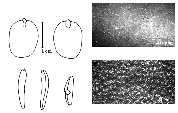 ). Pseudopleurogram absent. Fracture lines present, or absent; transverse. Rim absent. Wing(s) absent. Raphe not visible. Hilum present; fully concealed; concealed by funicular remnant; without faboid split (assumed); larger than punctiform; 0.4–0.5 mm long; with curved outline; circular; apical at apex of radicle tip; flush; not within corona, halo, or rim. Lens discernible; 0.5–1.3 mm long; with margins curved; elliptic; not in groove of raphe; adjacent to hilum; 0.3–0.5 mm from hilum; mounded; dissimilar color from testa; lighter than testa; white; not within corona, halo, or rim, or within corona; corona color darker than testa. Endosperm absent. Cotyledons not smooth; 4–6 grooves on each face; both outer faces flat; both the same thickness; both more or less of equal length; not folded; margin entire 180 degrees from base of radicle; similar at apex; partially concealing radicle; notched at radicle; with lobes; with lobes not touching; with basal groin formed by lobes; with the interface division terminating at base of radicle; without margins recessed; yellow; inner face flat; glabrous on inner face. Embryonic axis straight; parallel to length of seed; without a joint evident between the radicle and the cotyledons. Radicle differentiated from cotyledon; bulbose; lobe tip straight; straight with embryonic axis; centered between cotyledons; less than 1/2 length of cotyledons. Plumule well developed; glabrous.