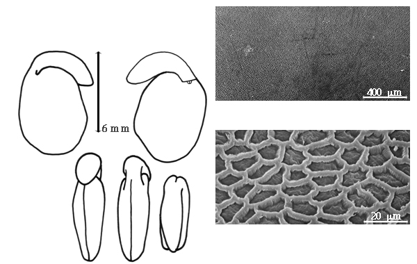Seed: 5.5–6 mm long; 4.5–5 mm wide; 3–3.3 mm thick; not overgrown; not angular; asymmetrical; ovate; compressed; with surface smooth; with visible radicle and cotyledon lobes; without external groove between radicle and cotyledon lobes; without hilar sinus; without umbo on seed faces; without medial ridge on each face. Cuticle not exfoliating; not inflated; not wrinkled. Testa present; without pieces of adhering epicarp; not adhering to endocarp; free from endocarp; dull; not modified by a bloom; colored; monochrome; dark reddish brown; glabrous; smooth; coriaceous. Pleurogram absent. Pseudopleurogram absent. Fracture lines absent. Rim absent. Wing(s) absent. Raphe not visible. Hilum present; fully concealed; concealed by funicular remnant; with faboid split; with the lips of the faboid split the same color as the rest of the hilum; punctiform; apical at apex of radicle tip, or between cotyledon and radicle lobe; recessed; within rim; rim color somewhat darker than testa. Lens discernible; 0.5–1 mm long; with margins straight, or curved; oblong; oblong; not in groove of raphe; confluent with hilum (hilar rim extends out to lens); mounded; similar color as testa; lighter than testa; reddish brown; not within corona, halo, or rim. Endosperm present; thick; not pluglike and not resembling tip of radicle; covering entire embryo; adnate to embryo. Cotyledons smooth; both outer faces convex; both the same thickness; both more or less of equal length; not folded; margin entire 180 degrees from base of radicle; similar at apex; not concealing radicle; split over radicle; with lobes; with the interface division terminating at base of radicle; without margins recessed; tan; inner face flat, or concave (or one concave and other convex); glabrous on inner face. Embryonic axis deflexed; oblique to length of seed; without a joint evident between the radicle and the cotyledons. Radicle differentiated from cotyledon; bulbose; lobe tip straight; deflexed and parallel to cotyledon length; centered between cotyledons; less than 1/2 length of cotyledons. Plumule rudimentary; glabrous.
