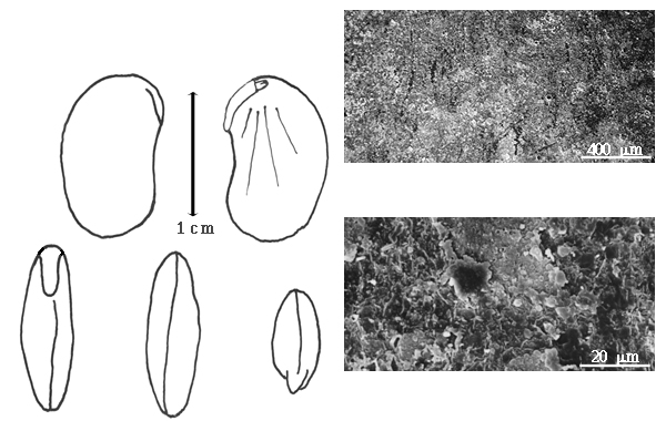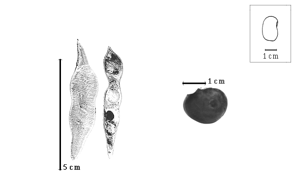 Seed: Ca. 11 mm long; 7–9 mm wide; 3–3.5 mm thick; not overgrown; not angular; symmetrical; elliptic; compressed; with surface smooth; without visible radicle and cotyledon lobes; without hilar sinus; without umbo on seed faces; without medial ridge on each face. Cuticle not exfoliating; not inflated; not wrinkled. Testa present; without pieces of adhering epicarp; not adhering to endocarp; free from endocarp; dull; not modified by a bloom; colored; monochrome; brown; glabrous; smooth, or not smooth; with elevated features; lightly rugose; chartaceous. Pleurogram absent. Pseudopleurogram absent. Fracture lines absent. Rim absent. Wing(s) absent. Raphe not visible. Hilum present; partially concealed; concealed by funicular remnant; with faboid split; with the lips of the faboid split the same color as the rest of the hilum; larger than punctiform; ca. 1.8 mm long; with curved outline; oval; recessed; within rim; rim color of testa. Lens not discernible. Endosperm absent. Cotyledons smooth; both outer faces convex; both the same thickness; both more or less of equal length; not folded; margin entire 180 degrees from base of radicle; similar at apex; not concealing radicle; entire over radicle; without lobes; with the interface division terminating at base of radicle; without margins recessed; brown; inner face flat; glabrous on inner face. Embryonic axis deflexed; oblique to length of seed; with a joint evident between the radicle and the cotyledons. Radicle differentiated from cotyledon; linear; lobe tip straight; oblique to cotyledons; centered between cotyledons; less than 1/2 length of cotyledons. Plumule rudimentary; glabrous.