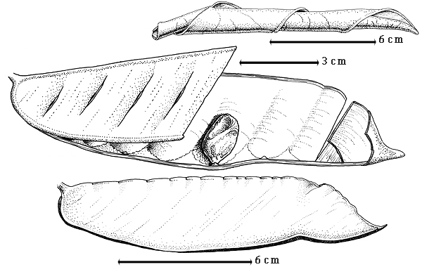 Fruit: A legume; unilocular; 9–19.5 cm long; 3–4.5 cm wide; 0.8–1.2 cm thick; 2–9 times longer than wide; with deciduous androecial sheath; with deciduous corolla; with deciduous calyx; without orifice formed by curving of fruit or fruit segments; straight to curved; not plicate; not twisted; symmetrical, or asymmetrical; oblong, or oblanceolate; with 1 straight and 1 curved suture; widest near middle or D-shaped, or widest near apex; not inflated; flattened; without beak; long tapered at apex; aligned with longitudinal axis of fruit; straight or rounded at base; aligned with longitudinal axis of fruit; with the apex and base uniform in texture; ligneous; seed chambers externally invisible; margin not constricted; margin without sulcus; margin plain; wing(s) absent; stipitate; with the stipe 6–10 mm long; with all layers dehiscing; splitting along suture(s). Dehiscence of valves along both sutures (initially along ventral); active; with valves separately breaking, or enrolling. Replum invisible. Epicarp dull; monochrome; dark reddish brown to reddish brown; with surface texture uniform; glabrous to pubescent and indurate (with golden hairs); with hairs erect; eglandular; without spines; not smooth; with elevated features; veined; transversely veined relative to fruit length; not tuberculate; rugose; not exfoliating (but often separating from mesocarp); without cracks; without embedded tissue, much thicker than epicarp, running from base to apex. Mesocarp present; surface not veined; 1-layered; without balsamic vesicles; without fibers; without reniform canals; solid; ligneous. Endocarp present; visible; dull; opaque; monochrome; reddish brown; without adhering pieces of testa; subseptate to nonseptate; not exfoliating; remaining fused to mesocarp and epicarp; entire. Seed(s) 2–12; length transverse to fruit length; neither overlapping nor touching; in 1 series. Funiculus 0.1–1 mm long; of 1 length only; thick; straight. Aril absent.