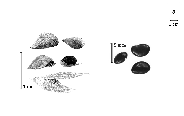 Fruit: A legume; unilocular; 0.6–1 cm long; 0.3–0.5 cm wide; 0.2–0.25 cm thick; length less than twice as long as width; with deciduous androecial sheath; with deciduous corolla; with persistent calyx, or deciduous calyx; with calyx longer than fruit, or shorter than fruit; without orifice formed by curving of fruit or fruit segments; straight; not plicate; not twisted; asymmetrical; with 1 straight and 1 curved suture; widest near middle or D-shaped; barely inflated, or not inflated; compressed; without beak; short tapered at apex; aligned with longitudinal axis of fruit; rounded at base; oblique with longitudinal axis of fruit; with the apex and base differing in texture; upper 3/4 barely inflated, reticulate, and pubescent and lower 1/4 not inflated, reticulate, or pubescent; chartaceous; seed chambers externally invisible; margin not constricted; margin without sulcus; margin plain; wing(s) absent; nonstipitate; indehiscent. Replum invisible. Epicarp dull; monochrome; brown; with surface texture uniform; pubescent and indurate; with hairs erect; with 1 type of pubescence; pilose; with pubescence golden; with pubescence uniformly distributed; with simple hairs; pliable; with hair bases plain; glandular; with glandular dots; limited to a portion of fruit; upper 3/4 glandular and lower 1/4 eglandular; without spines; not smooth; with elevated features; veined, or not veined; transversely veined relative to fruit length; not tuberculate; not exfoliating; without cracks; without embedded tissue, much thicker than epicarp, running from base to apex. Mesocarp absent. Endocarp present; visible; dull; opaque; monochrome; tan; smooth; without adhering pieces of testa; nonseptate; chartaceous; not exfoliating; remaining fused to epicarp; without wings; entire. Seed(s) 1; length parallel with fruit length. Funiculus less than 1 mm long; thick; straight. Aril absent.