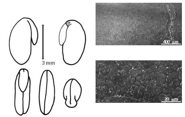 Seed: 5.5–6.7 mm long; 3.5–3.7 mm wide; 2–2.5 mm thick; not overgrown; not angular; symmetrical (except for hilum); elliptic; compressed; without visible radicle and cotyledon lobes; without hilar sinus; without umbo on seed faces; without medial ridge on each face. Cuticle not exfoliating; not inflated; not wrinkled. Testa present; without pieces of adhering epicarp; not adhering to endocarp; free from endocarp; glossy; not modified by a bloom; colored; monochrome, or streaked; with frequent streaks; dark reddish brown; with brown overlay (broad bands of darker); glabrous; smooth, or not smooth; with recessed features; pitted with small separate pits (some seeds with numerous pits and other seeds with few to no pits H. strobilina (J.W. Hooker & G.A. Arnott) G.A.W. Rydberg); coriaceous. Pleurogram absent. Pseudopleurogram absent. Fracture lines absent. Rim absent. Wing(s) absent. Raphe not visible. Hilum present; visible (with conspicuous light tan rim); with faboid split; with the lips of the faboid split the same color as the rest of the hilum; punctiform; marginal according to radicle tip; recessed; within rim; rim color of testa to lighter than testa. Lens not discernible. Endosperm present; thin; not pluglike and not resembling tip of radicle; covering entire embryo; adnate to testa. Cotyledons smooth; both outer faces convex; both the same thickness; both more or less of equal length; not folded; margin entire 180 degrees from base of radicle; similar at apex; not concealing radicle; entire over radicle; without lobes; with the interface division terminating in radicle tissue; without margins recessed; yellow; inner face flat; glabrous on inner face. Embryonic axis deflexed; parallel to length of seed; without a joint evident between the radicle and the cotyledons. Radicle differentiated from cotyledon; linear; deflexed and parallel to cotyledon length; centered between cotyledons; 1/2 to nearly length of cotyledons. Plumule moderately developed; glabrous.