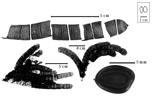Fruit: A loment (or a loment segment); (4.5–)5–12.5 cm long (Barneby and Grimes, 1996); 0.75–1.9 cm wide (Barneby and Grimes, 1996); 0.2–0.4 cm thick; 2–9 times longer than wide; with deciduous androecial sheath; with deciduous corolla; with deciduous calyx; without orifice formed by curving of fruit or fruit segments; straight, or curved; not plicate; not twisted; symmetrical, or asymmetrical; oblong, or linear, or falcate; with both sutures nearly straight, or both sutures parallelly curved; not inflated; flattened; with beak, or without beak; straight; with solid beak the same color and texture as fruit; rounded at apex, or tapered at apex (rarely); aligned with longitudinal axis of fruit; tapered at base; aligned with longitudinal axis of fruit; with the apex and base uniform in texture; leathery, or ligneous; seed chambers externally visible; seed chambers with the raised seed chambers not torulose; margin not constricted; margin without sulcus; margin embellished; margin with thickened sutural areas; wing(s) absent; nonstipitate, or substipitate (with pseudostipe, Barneby and Grimes, 1996); with the stipe 1–5 mm long; indehiscent. Replum invisible. Loment an intact article; indehiscent; segments (articles) conspicuous; segments (articles) (5–)5.5–9(–10) mm long (Barneby and Grimes, 1996); segments (articles) widest across seed area; segments (articles) with apical 1 different shape than middle one(s); segments (articles) oblong, or D-shaped (apical segment). Epicarp dull; monochrome; dark brown; with surface texture uniform; pubescent and indurate; with hairs erect; with 1 type of pubescence; minutely puberulent; with pubescence brown; pubescence denser near sutures, sparser centrally; with simple hairs; pliable; with hair bases plain; eglandular; without spines; not smooth; with elevated features; veined; transversely veined relative to fruit length; not tuberculate; not exfoliating; without cracks; without embedded tissue, much thicker than epicarp, running from base to apex. Mesocarp present, or absent; thick; surface not veined; 1-layered; without balsamic vesicles; without fibers; without reniform canals; solid; chartaceous. Endocarp present; visible; dull, or glossy; opaque; monochrome; tan; smooth, or smooth and scurfy (sometimes in a small area under the seed); without adhering pieces of testa; septate; with septa thicker than paper, firm; with septa eglandular; coriaceous; not exfoliating; remaining fused to mesocarp and epicarp; remaining fused to epicarp; without wings; entire. Seed(s) 8–13 (in fruits prior to separation of loments, Barneby and Grimes, 1996); length parallel with fruit length; neither overlapping nor touching; in 1 series. Funiculus 1–2 mm long; of 1 length only; filiform; convoluted, or straight. Aril absent.