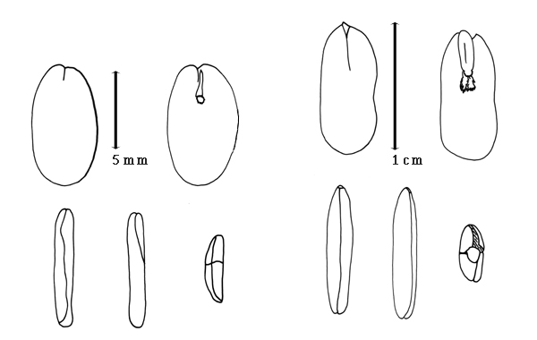 Seed: 7.3–10.5 mm long; 4–6 mm wide; 1.5–2 mm thick; not overgrown; not angular; symmetrical; narrowly obovate, or irregular; flattened; with surface smooth; without visible radicle and cotyledon lobes; without hilar sinus; without umbo on seed faces; without medial ridge on each face. Cuticle not exfoliating; not inflated; not wrinkled. Testa present; without pieces of adhering epicarp; not adhering to endocarp; free from endocarp; dull; not modified by a bloom; colored; monochrome; brown; glabrous; smooth; chartaceous. Pleurogram present; 100 %. Pseudopleurogram absent. Fracture lines absent. Rim absent. Wing(s) absent. Raphe not visible. Hilum present; fully concealed; concealed by funicular remnant; without faboid split (assumed); punctiform; apical at apex of radicle tip; flush; not within corona, halo, or rim. Lens discernible; 0.1–0.5 mm long; with margins curved; circular, or elliptic; not in groove of raphe; adjacent to hilum; 0.1–0.2 mm from hilum; recessed; same color as testa; brown; not within corona, halo, or rim. Endosperm present; thin; not pluglike and not resembling tip of radicle; covering entire embryo; adnate to testa. Cotyledons smooth; both outer faces convex; both the same thickness; both more or less of equal length; not folded; margin entire 180 degrees from base of radicle; similar at apex; completely concealing radicle, or partially concealing radicle; split over radicle; without lobes; with the interface division terminating at base of radicle; without margins recessed; tan; inner face flat; glabrous on inner face. Embryonic axis parallel; parallel to length of seed; without a joint evident between the radicle and the cotyledons. Radicle differentiated from cotyledon; bulbose; lobe tip straight; straight with embryonic axis; centered between cotyledons; less than 1/2 length of cotyledons. Plumule well developed; glabrous.