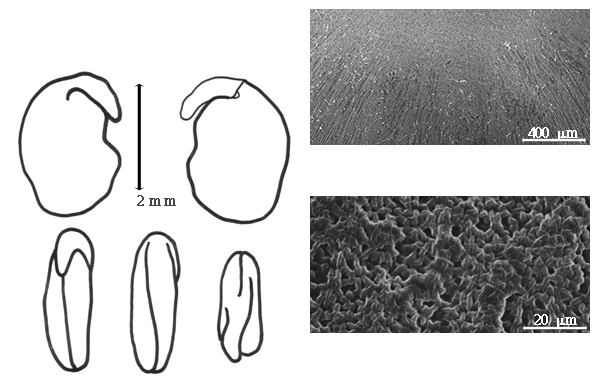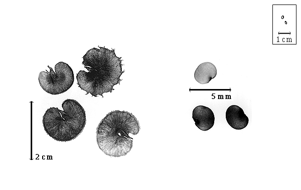 Seed: 1–3 mm long; 2–2.5 mm wide; 1 mm thick; not overgrown; not angular; asymmetrical; reniform; compressed; with surface smooth; without visible radicle and cotyledon lobes; without umbo on seed faces; without medial ridge on each face. Cuticle not exfoliating; not inflated; not wrinkled. Testa present; without pieces of adhering epicarp; not adhering to endocarp; free from endocarp; dull; not modified by a bloom; colored; monochrome; reddish brown, or tan, or cream, or yellow; glabrous; smooth; coriaceous. Pleurogram absent. Pseudopleurogram absent. Fracture lines absent. Rim absent. Wing(s) absent. Raphe not visible. Hilum present; fully concealed; concealed by funicular remnant; without faboid split; punctiform; between cotyledon and radicle lobe; somewhat recessed; not within corona, halo, or rim (if testa light colored), or within halo (if testa dark colored); halo darker than testa. Lens discernible; with margins curved; elliptic; not in groove of raphe; confluent with hilum; mounded; dissimilar color from testa; darker than testa; black; not within corona, halo, or rim. Endosperm absent. Cotyledons smooth; both outer faces convex; both the same thickness; both more or less of equal length; not folded; margin entire 180 degrees from base of radicle; similar at apex; not concealing radicle; entire over radicle; without lobes; with the interface division terminating at base of radicle; without margins recessed; light tan; inner face flat; glabrous on inner face. Embryonic axis deflexed; oblique to length of seed; with a joint evident between the radicle and the cotyledons. Radicle differentiated from cotyledon; linear; deflexed and parallel to cotyledon length; centered between cotyledons; less than 1/2 length of cotyledons. Plumule rudimentary; glabrous.