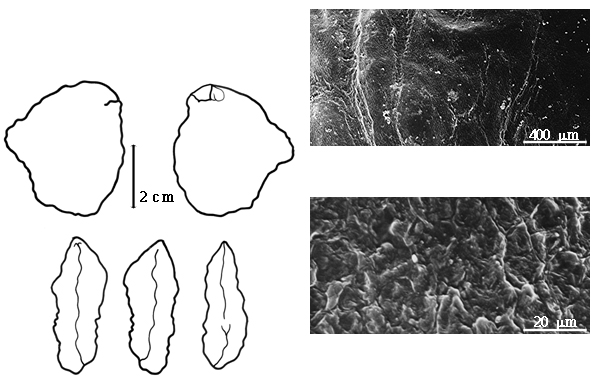 Seed: 4–4.5 mm long; 4 mm wide; 2.5 mm thick; overgrown, 1 seed filling entire fruit cavity; angular; asymmetrical; oblong; terete; with surface smooth; without visible radicle and cotyledon lobes; without umbo on seed faces; without medial ridge on each face. Cuticle not exfoliating; not inflated; not wrinkled. Testa present; without pieces of adhering epicarp; not adhering to endocarp; free from endocarp; dull; not modified by a bloom; colored; monochrome; brown (dark reddish); glabrous; not smooth; with elevated features; veined and wrinkled; coriaceous. Pleurogram absent. Pseudopleurogram absent. Fracture lines absent. Rim present; wing-like along 1 side of seed. Wing(s) present. Raphe visible (if the wing is consider the raphe); from hilum to near base of seed and terminating; not bifurcating; color of testa; raised. Hilum present; fully concealed; concealed by funicular remnant; without faboid split; larger than punctiform; 0.5 mm long; with curved outline, or straight outline; circular; oblong; marginal according to radicle tip; recessed; not within corona, halo, or rim. Lens not discernible. Endosperm absent. Cotyledons not smooth (wrinkled); both outer faces convex; both the same thickness; both more or less of equal length; not folded; margin entire 180 degrees from base of radicle; similar at apex; completely concealing radicle; split over radicle; with lobes; with the interface division terminating at base of radicle; without margins recessed; tan (dirty); inner face flat; glabrous on inner face. Embryonic axis deflexed; oblique to length of seed; without a joint evident between the radicle and the cotyledons. Radicle differentiated from cotyledon; linear; deflexed and parallel to cotyledon width; centered between cotyledons; less than 1/2 length of cotyledons. Plumule rudimentary; glabrous.