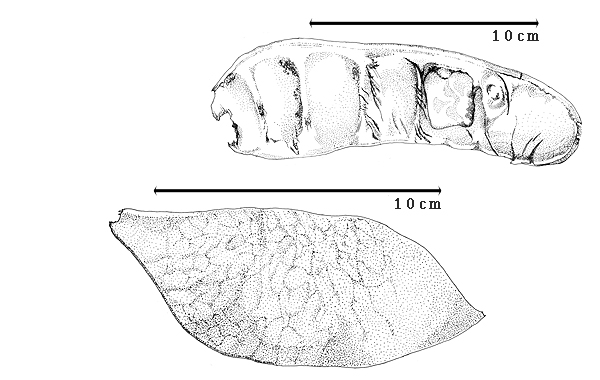Seed: (15–)20–43 mm long; (10–)17–35 mm wide; 7–11 mm thick; not overgrown; angular, or not angular; symmetrical; elliptic to ovate, or oblong, or triangular to quadrangular; compressed; with surface smooth; without visible radicle and cotyledon lobes; without hilar sinus; without umbo on seed faces; without medial ridge on each face. Cuticle not exfoliating; not inflated; not wrinkled. Testa present; without pieces of adhering epicarp; not adhering to endocarp; free from endocarp; dull; not modified by a bloom; colored; monochrome; black (with patches of reddish brown to yellow brown scurf from endocarp); glabrous; smooth; osseous. Pleurogram absent. Pseudopleurogram absent. Fracture lines absent. Rim absent. Wing(s) absent. Raphe not visible. Hilum present; visible, or fully concealed; concealed by funicular remnant; without faboid split; larger than punctiform; 0.1–1.5 mm long; with straight outline; apical at apex of radicle tip; flush; not within corona, halo, or rim. Lens discernible, or not discernible; 2 mm long (180 degrees from hilum); with margins curved; circular; not in groove of raphe; mounded; same color as testa; not within corona, halo, or rim. Endosperm absent. Cotyledons smooth; both outer faces convex; both the same thickness; both more or less of equal length; not folded; margin entire 180 degrees from base of radicle; similar at apex; partially concealing radicle (only tip exposed); notched at radicle and split over radicle; with the interface division terminating at base of radicle; without margins recessed; inner face flat; glabrous on inner face. Embryonic axis straight; parallel to length of seed; without a joint evident between the radicle and the cotyledons. Radicle differentiated from cotyledon; centered between cotyledons. Plumule rudimentary; glabrous.
