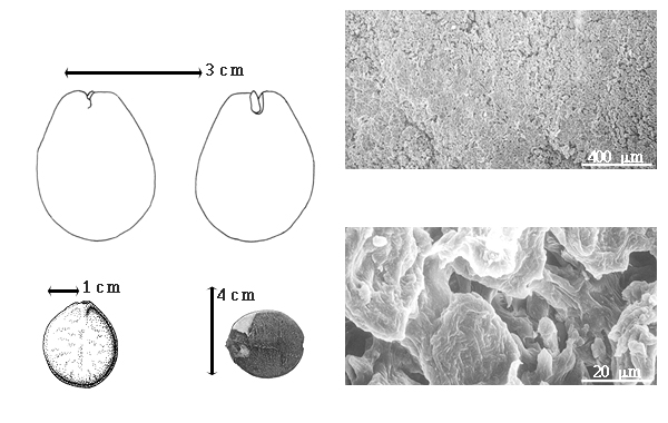 Seed: 25–33 mm long; 18–30 mm wide; 6–7 mm thick; not overgrown; not angular; symmetrical; ovate to oblong; flattened; with surface smooth; without visible radicle and cotyledon lobes; without hilar sinus; without umbo on seed faces; without medial ridge on each face. Cuticle not exfoliating; not inflated; not wrinkled. Testa present; without pieces of adhering epicarp; not adhering to endocarp; free from endocarp; dull; not modified by a bloom; colored; monochrome; brown; glabrous; not smooth; with elevated features; faintly rugose; chartaceous. Pleurogram absent. Pseudopleurogram absent. Fracture lines absent. Rim absent. Wing(s) absent. Raphe not visible. Hilum present; fully concealed; concealed by funicular remnant; without faboid split; larger than punctiform; 0.1–5 mm long; with curved outline; elliptic; apical at apex of radicle tip; flush; not within corona, halo, or rim. Lens not discernible. Endosperm absent. Cotyledons smooth; both outer faces convex; both the same thickness; both more or less of equal length; not folded; margin entire 180 degrees from base of radicle; similar at apex; partially concealing radicle (only tip exposed); notched at radicle and split over radicle, or notched at radicle (only); with the interface division terminating at base of radicle; without margins recessed; inner face flat; glabrous on inner face. Embryonic axis straight; parallel to length of seed; without a joint evident between the radicle and the cotyledons. Radicle differentiated from cotyledon; centered between cotyledons. Plumule rudimentary; glabrous.