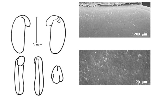 Seed: 3.7–8.5 mm long; 3.8–5 mm wide (including aril); 2.8–2.9 mm thick; not overgrown; not angular; asymmetrical; reniform; terete; with surface smooth; without visible radicle and cotyledon lobes; without hilar sinus; without umbo on seed faces; without medial ridge on each face. Cuticle not exfoliating; not inflated; not wrinkled. Testa present; without pieces of adhering epicarp; not adhering to endocarp; free from endocarp; dull; not modified by a bloom; colored; monochrome, or mottled; with frequent mottles; brown (or dark brown); with brown overlay (darker); glabrous; smooth; coriaceous. Pleurogram absent. Pseudopleurogram absent. Fracture lines absent. Rim absent. Wing(s) absent. Raphe not visible. Hilum present; partially concealed; concealed by aril; with faboid split; with the lips of the faboid split the same color as the rest of the hilum; larger than punctiform; 2.4 mm long; with curved outline; elliptic; marginal according to radicle tip; flush; within halo; halo darker than testa. Lens discernible (but mostly hidden by aril); 0.5–1.5 mm long; with margins straight; linear; not in groove of raphe; confluent with hilum; flush; similar color as testa; darker than testa; within halo; halo color darker than testa. Endosperm present; thick; not pluglike and not resembling tip of radicle; covering entire embryo; adnate to embryo. Cotyledons not smooth; sulcate; both outer faces convex; both the same thickness; both more or less of equal length; not folded; margin entire 180 degrees from base of radicle; similar at apex; not concealing radicle; entire over radicle; without lobes; with the interface division terminating at base of radicle; without margins recessed; tan; inner face flat; glabrous on inner face. Embryonic axis oblique; oblique to length of seed, or parallel to length of seed; without a joint evident between the radicle and the cotyledons. Radicle differentiated from cotyledon; bulbose; lobe tip curved; oblique to cotyledons; centered between cotyledons; less than 1/2 length of cotyledons. Plumule well developed; glabrous.