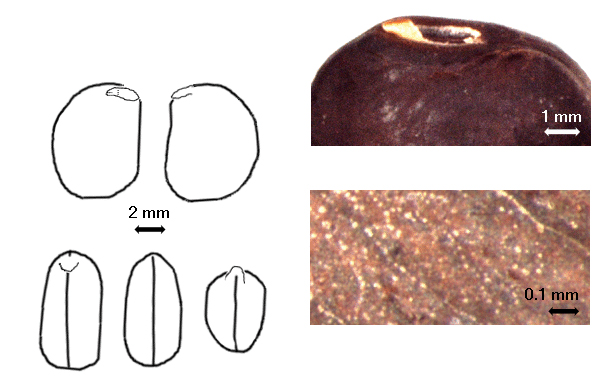Seed: 4–9 mm long; 4–7 mm wide; 3.5–6.5 mm thick; not overgrown; not angular; symmetrical; circular to elliptic; terete; with surface smooth; without visible radicle and cotyledon lobes; without hilar sinus; without umbo on seed faces; without medial ridge on each face. Cuticle not exfoliating; not inflated; not wrinkled. Testa present; without pieces of adhering epicarp; not adhering to endocarp; free from endocarp; dull, or glossy (rarely); not modified by a bloom; colored; monochrome, or streaked; with frequent streaks, or infrequent streaks; brown to red (blackish), or tan; with brown overlay, or tan overlay; glabrous; smooth; coriaceous. Pleurogram absent. Pseudopleurogram absent. Fracture lines absent. Rim absent. Wing(s) absent. Raphe visible, or not visible; from hilum through lens and terminating before base of seed; not bifurcating; color of testa, or lighter than testa, or darker than testa; brown; flush, or recessed. Hilum present; visible; with faboid split; with the lips of the faboid split the same color as the rest of the hilum; larger than punctiform; 1.2–2.8 mm long; with curved outline, or straight outline; narrowly elliptic; oblong; apical according to radicle tip but marginal according to seed length; flush; within halo, or within rim; halo of testa; rim color of testa. Lens discernible, or not discernible; 0.7 mm long; with margins curved; elliptic; not in groove of raphe; confluent with hilum; flush; same color as testa, or dissimilar color from testa; darker than testa; brown; not within corona, halo, or rim. Endosperm apparently absent. Cotyledons smooth; both outer faces convex; both the same thickness; both more or less of equal length; not folded; margin entire 180 degrees from base of radicle; similar at apex; not concealing radicle; slightly notched at radicle; without lobes; with the interface division terminating at base of radicle; without margins recessed; tan; inner face flat; glabrous on inner face. Embryonic axis straight to oblique (slightly); perpendicular to length of seed; without a joint evident between the radicle and the cotyledons. Radicle differentiated from cotyledon; bulbose; lobe tip straight; perpendicular to cotyledons; centered between cotyledons; less than 1/2 length of cotyledons. Plumule rudimentary; glabrous.