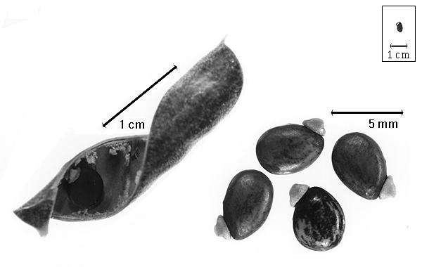 Seed: 5.3–6 mm long; 3.5–4 mm wide; 1.7–2.5 mm thick; not overgrown; not angular; asymmetrical; oblong; compressed; without visible radicle and cotyledon lobes; without hilar sinus; without umbo on seed faces; without medial ridge on each face. Cuticle not exfoliating; not inflated; not wrinkled. Testa present; without pieces of adhering epicarp; not adhering to endocarp; free from endocarp; dull; not modified by a bloom; colored; monochrome (when immature), or mottled (when mature), or streaked (when mature); with frequent mottles; with frequent streaks; reddish brown; with brown overlay (darker reddish); glabrous; smooth; coriaceous. Pleurogram absent. Pseudopleurogram absent. Fracture lines absent. Rim absent. Wing(s) absent. Raphe visible; from hilum through lens to base of seed and terminating (beyond base of seed); not bifurcating; darker than testa; recessed. Hilum present; partially concealed; concealed by aril; with faboid split; with the lips of the faboid split the same color as the rest of the hilum; larger than punctiform; 2 mm long; with curved outline; elliptic; apical according to radicle tip but marginal according to seed length; recessed; not within corona, halo, or rim. Lens discernible; with margins curved; elliptic; in groove of raphe; adjacent to hilum; 1.5 mm from hilum; mounded; similar color as testa; darker than testa; not within corona, halo, or rim. Endosperm present; thin; not pluglike and not resembling tip of radicle; covering entire embryo; adnate to testa. Cotyledons smooth; both outer faces convex; both the same thickness; both more or less of equal length; margin entire 180 degrees from base of radicle; similar at apex; partially concealing radicle; split over radicle; with lobes; with lobes touching (auriculate); with the interface division terminating at base of radicle; without margins recessed; yellow; inner face flat; glabrous on inner face. Embryonic axis deflexed; oblique to length of seed; without a joint evident between the radicle and the cotyledons. Radicle differentiated from cotyledon; bulbose; oblique to cotyledons; centered between cotyledons; less than 1/2 length of cotyledons. Plumule rudimentary; glabrous.