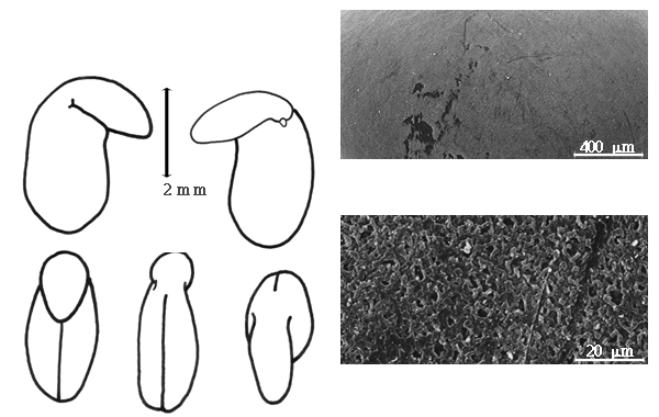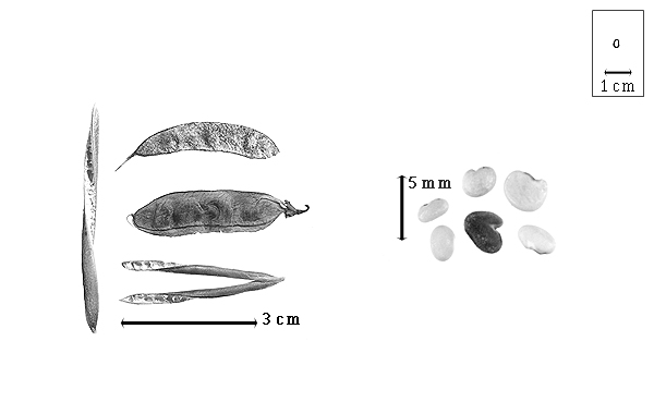 Seed: 3–4 mm long; 1.7–2.2 mm wide; 1.2–1.5 mm thick; not overgrown; not angular to angular; asymmetrical; obliquely cordate, or oblong (reniform), or rectangular, or reniform; compressed; with visible radicle and cotyledon lobes (barely); without external groove between radicle and cotyledon lobes; without umbo on seed faces; without medial ridge on each face. Cuticle not exfoliating; not inflated; not wrinkled. Testa present; without pieces of adhering epicarp; not adhering to endocarp; free from endocarp; dull; not modified by a bloom; colored; monochrome, or mottled and streaked; with frequent mottles; with frequent streaks; tan; with brown overlay (dark reddish to purplish); glabrous; smooth, or not smooth; with elevated features; faintly warty; coriaceous. Pleurogram absent. Pseudopleurogram absent. Fracture lines absent. Rim absent. Wing(s) absent. Raphe not visible. Hilum present; visible; with faboid split; with the lips of the faboid split the same color as the rest of the hilum; punctiform; between cotyledon and radicle lobe; recessed; within rim, within halo, and within corona, or within rim; corona color darker than testa; halo of testa; rim color of testa, or darker than testa. Lens discernible; 0.7–1 mm long; with margins straight, or curved; wedge-shaped (elongated and ending or not in circular area); circular (above elongated wedge-shape); not in groove of raphe; adjacent to hilum; mounded; dissimilar color from testa; darker than testa; reddish to orangish to dark brown; not within corona, halo, or rim. Endosperm present; thick; not pluglike and not resembling tip of radicle; covering entire embryo; adnate to embryo. Cotyledons smooth; both outer faces convex; both the same thickness; both more or less of equal length; not folded; margin entire 180 degrees from base of radicle; similar at apex; not concealing radicle; entire over radicle; without lobes; with the interface division terminating at base of radicle; without margins recessed; tan; inner face flat; glabrous on inner face. Embryonic axis deflexed; oblique to length of seed; without a joint evident between the radicle and the cotyledons. Radicle differentiated from cotyledon; bulbose; deflexed and parallel to cotyledon width to deflexed and parallel to cotyledon length; centered between cotyledons; less than 1/2 length of cotyledons. Plumule rudimentary, or moderately developed; glabrous.