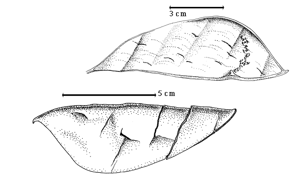 Fruit: A legume; unilocular; 10–11 cm long; 3.5–4 cm wide; 0.5–0.7 cm thick; 2–9 times longer than wide; with deciduous androecial sheath; with deciduous corolla; with deciduous calyx; without orifice formed by curving of fruit or fruit segments; straight; not plicate; not twisted; asymmetrical; with 1 straight and 1 curved suture; widest near apex; not inflated; flattened; without beak; tapered at apex; aligned with longitudinal axis of fruit; tapered at base; aligned with longitudinal axis of fruit; with the apex and base uniform in texture; ligneous; seed chambers externally visible; margin not constricted; margin without sulcus; margin plain; wing(s) absent; with all layers dehiscing; splitting along suture(s). Dehiscence of valves along both sutures (?). Replum invisible. Epicarp dull; monochrome; dirty brown; with surface texture uniform; glabrous; eglandular; without spines; not smooth; with recessed features; not veined; not tuberculate; minutely punctate; not exfoliating; without cracks; without embedded tissue, much thicker than epicarp, running from base to apex. Mesocarp present; surface not veined; 2-layered; without balsamic vesicles; with fibers; without reniform canals; with fibers embedded in mealy tissue over solid layer; ligneous. Endocarp present; visible; dull; opaque; monochrome; dirty brown; without adhering pieces of testa; nonseptate; not exfoliating; remaining fused to mesocarp and epicarp; entire. Seed(s) 1; length oblique to fruit length. Funiculus 0.1–3 mm long; of 1 length only; thick; triangular. Aril absent.