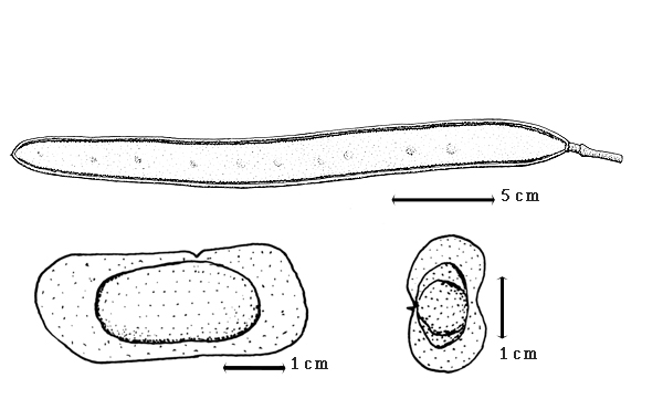 Fruit: A legume; unilocular; (8–)15–35 cm long; 2–2.5 cm wide; 0.2–0.3 cm thick (estimated); 2–9 times longer than wide, or more than 9 times longer than wide; with deciduous androecial sheath; with deciduous corolla; with deciduous calyx; without orifice formed by curving of fruit or fruit segments; straight; not plicate; not twisted; symmetrical; narrowly elliptic, or oblong; not inflated; without beak; short tapered at apex; aligned with longitudinal axis of fruit; tapered at base; aligned with longitudinal axis of fruit; with the apex and base uniform in texture; seed chambers externally visible; seed chambers with the raised seed chambers not torulose; margin not constricted; margin without sulcus; margin plain; wing(s) absent; substipitate, or nonstipitate; with the stipe up to 5 mm long; with all layers dehiscing; splitting along suture(s). Dehiscence of valves along both sutures; passive. Replum invisible. Epicarp monochrome; dark gray; with surface texture uniform; glabrous; eglandular (?); without spines; not smooth; with faintly elevated features; veined; obliquely veined relative to fruit length; not tuberculate; not exfoliating (Does this mean, "exocapium caducum"?); without embedded tissue, much thicker than epicarp, running from base to apex. Endocarp present; nonseptate; not exfoliating; entire. Seed(s) 10; length parallel with fruit length. Funiculus of 1 length only. Aril absent.