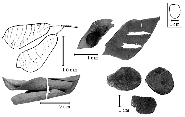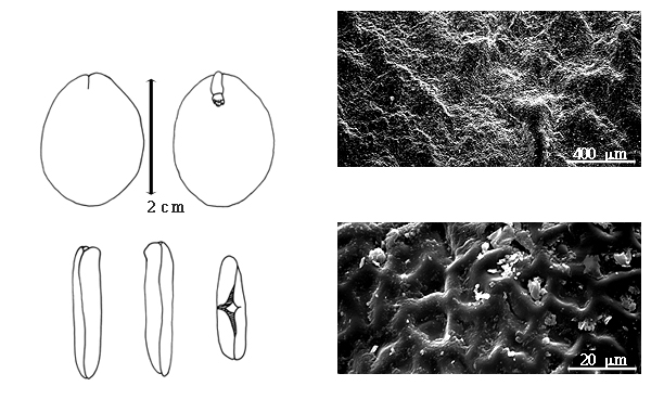 Seed: 15–25 mm long; 12–20 mm wide; 2–3 mm thick; not overgrown; not angular; symmetrical, or asymmetrical; ovate, or oblong; compressed; with surface smooth; without visible radicle and cotyledon lobes; without hilar sinus; without umbo on seed faces; without medial ridge on each face. Cuticle not exfoliating; not inflated; not wrinkled. Testa present; without pieces of adhering epicarp; not adhering to endocarp; free from endocarp; dull; not modified by a bloom; colored; monochrome; dark brown; glabrous; not smooth; with elevated features; rugose (especially on face); coriaceous. Pleurogram absent. Pseudopleurogram absent. Fracture lines absent. Rim absent, or present (very narrowly so); wing-like around seed. Wing(s) absent. Raphe not visible. Hilum present; fully concealed; concealed by funicular remnant; without faboid split; larger than punctiform; ca. 1 mm long; with curved outline; elliptic; apical at apex of radicle tip; flush; not within corona, halo, or rim. Lens not discernible. Endosperm absent. Cotyledons smooth; both outer faces convex; both the same thickness; both more or less of equal length; not folded; margin entire 180 degrees from base of radicle; similar at apex; completely concealing radicle; split over radicle; without lobes; with the interface division terminating at base of radicle; without margins recessed; brown; inner face flat; glabrous on inner face. Embryonic axis straight; parallel to length of seed; with a joint evident between the radicle and the cotyledons. Radicle differentiated from cotyledon; bulbose; lobe tip straight; straight with embryonic axis; centered between cotyledons; less than 1/2 length of cotyledons. Plumule moderately developed; glabrous.