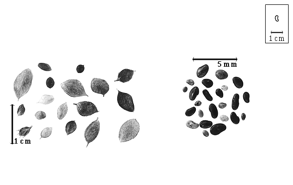 Seed: 1.5–5 mm long; 1.3–3 mm wide; 0.7–1.5 mm thick; not overgrown; not angular; asymmetrical; reniform; compressed; with surface smooth; without visible radicle and cotyledon lobes, or with visible radicle and cotyledon lobes; without external groove between radicle and cotyledon lobes, or with external groove between radicle and cotyledon lobes; with external groove between radicle and cotyledon lobes same color as testa; without hilar sinus; without umbo on seed faces; without medial ridge on each face. Cuticle not exfoliating; not inflated; not wrinkled. Testa present; without pieces of adhering epicarp; not adhering to endocarp; free from endocarp; glossy, or dull; not modified by a bloom; colored; monochrome, or mottled and streaked; with frequent mottles; light to dark reddish brown, or tan, or purple, or yellow (greenish), or green, or black; with purple overlay; glabrous; smooth; coriaceous. Pleurogram absent. Pseudopleurogram absent. Fracture lines absent. Rim absent. Wing(s) absent. Raphe not visible. Hilum present; visible; with faboid split; with the lips of the faboid split the same color as the rest of the hilum; punctiform, or larger than punctiform; 0.3–0.6 mm long; with straight outline; oblong; marginal according to radicle tip; recessed; within halo; halo lighter than testa, or darker than testa. Lens discernible; with margins straight, or curved; oblong, or wedge-shaped, or linear (somewhat and with or without medial groove); circular, or oblong; not in groove of raphe; confluent with hilum, or adjacent to hilum; 0.1–0.2 mm from hilum; flush; dissimilar color from testa; darker than testa, or lighter than testa; black, or tan; not within corona, halo, or rim. Endosperm present; thin; not pluglike and not resembling tip of radicle; covering entire embryo; adnate to testa, or embryo. Cotyledons smooth; both outer faces convex; both the same thickness; both more or less of equal length; not folded; margin entire 180 degrees from base of radicle; similar at apex; not concealing radicle; entire over radicle; without lobes; with the interface division terminating at base of radicle; without margins recessed; white, or yellow, or green, or tan; inner face flat; glabrous on inner face. Embryonic axis deflexed; oblique to length of seed; without a joint evident between the radicle and the cotyledons. Radicle differentiated from cotyledon; linear; deflexed and parallel to cotyledon length; centered between cotyledons; less than 1/2 length of cotyledons. Plumule moderately developed, or rudimentary; glabrous.