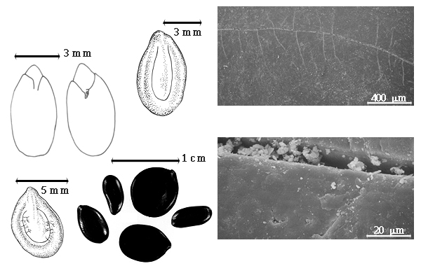 Seed: 5–11.8 mm long; 2.7–10.6 mm wide (Hughes, 1998a, 1998b); 1–2 mm thick; not overgrown; not angular; symmetrical; ovate to circular, or oblong; compressed; with surface smooth; without visible radicle and cotyledon lobes; without hilar sinus; without umbo on seed faces; without medial ridge on each face. Cuticle not exfoliating; not inflated; not wrinkled. Testa present; without pieces of adhering epicarp; not adhering to endocarp; free from endocarp; glossy; not modified by a bloom; colored; monochrome; brown; glabrous; smooth, or not smooth; with elevated features and recessed features; bearing a raised line (more like a ridge from apex to middle of areola); shallowly pitted with small separate pits (especially outside of areola); osseous. Pleurogram present; 75–90 %. Pseudopleurogram absent. Fracture lines present. Rim absent. Wing(s) absent. Raphe not visible. Hilum present; visible; without faboid split; punctiform; subapical to radicle tip; flush; not within corona, halo, or rim. Lens discernible; 0.3–0.4 mm long; with margins straight, or curved; linear (and inconspicuous); elliptic (and conspicuous); not in groove of raphe; mounded; similar color as testa, or dissimilar color from testa; lighter than testa; tan to white; not within corona, halo, or rim. Endosperm present; thin to thick; not pluglike and not resembling tip of radicle; adnate to testa. Cotyledons smooth; both outer faces flat; both the same thickness; both more or less of equal length; not folded; margin entire 180 degrees from base of radicle; similar at apex; partially concealing radicle; with lobes; with lobes not touching; with the interface division terminating at base of radicle; without margins recessed; inner face flat; glabrous on inner face. Embryonic axis straight; parallel to length of seed; without a joint evident between the radicle and the cotyledons. Radicle differentiated from cotyledon; deflexed and parallel to cotyledon length; centered between cotyledons. Plumule moderately developed; glabrous.