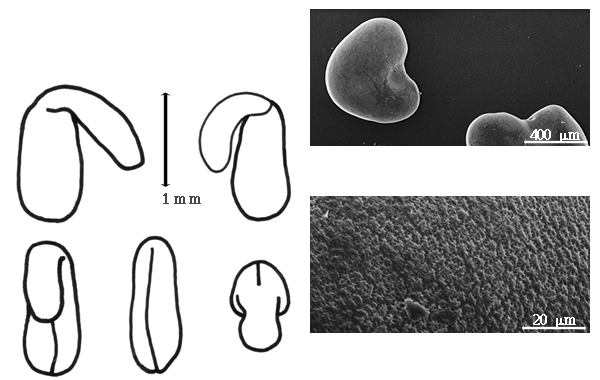 Seed: 1–3 mm long; 1–2.8 mm wide; 0.5–0.7 mm thick; not overgrown; not angular; asymmetrical; mitaform, or reniform, or cordate (obliquely); compressed; with visible radicle and cotyledon lobes; without external groove between radicle and cotyledon lobes; without umbo on seed faces; without medial ridge on each face. Cuticle not exfoliating; not inflated; not wrinkled. Testa present; without pieces of adhering epicarp; not adhering to endocarp; free from endocarp; glossy, or dull; not modified by a bloom; colored; monochrome, or bichrome (especially yellows and purples or brown with black tubercles), or mottled and streaked; with frequent mottles; with frequent streaks; red (dish to yellowish), or yellow (to greenish), or purple (to tannish); with black overlay, or purple overlay; glabrous; smooth, or not smooth; with elevated features; tuberculate (minute and densely to sparsely); coriaceous. Pleurogram absent. Pseudopleurogram absent. Fracture lines absent. Rim absent. Wing(s) absent. Raphe not visible. Hilum present; visible; with faboid split; with the lips of the faboid split the same color as the rest of the hilum; punctiform; between cotyledon and radicle lobe; recessed; within rim; rim color of testa, or darker than testa. Lens discernible; with margins curved; more or less circular; not in groove of raphe; adjacent to hilum; 0.1–0.4 mm from hilum; mounded; same color as testa, or similar color as testa, or dissimilar color from testa; lighter than testa, or darker than testa; brown; not within corona, halo, or rim. Endosperm present; thin; not pluglike and not resembling tip of radicle; covering entire embryo; adnate to embryo. Cotyledons smooth; both outer faces convex; both the same thickness; both more or less of equal length; not folded; margin entire 180 degrees from base of radicle; similar at apex; not concealing radicle; entire over radicle; without lobes; with the interface division terminating at base of radicle; without margins recessed; yellow; inner face flat; glabrous on inner face. Embryonic axis deflexed; oblique to length of seed; without a joint evident between the radicle and the cotyledons. Radicle differentiated from cotyledon; bulbose; deflexed and parallel to cotyledon length; centered between cotyledons; 1/2 to nearly length of cotyledons. Plumule rudimentary; glabrous.