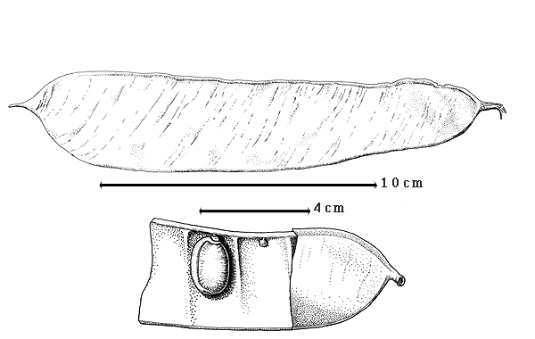 Fruit: A legume; unilocular; 15–22 cm long; 3.5–4.5 cm wide; 0.5 cm thick; 2–9 times longer than wide; with deciduous androecial sheath; with deciduous corolla; with deciduous calyx; without orifice formed by curving of fruit or fruit segments; curved; not plicate; not twisted; asymmetrical; oblanceolate to oblong; not inflated; flattened; without beak; rounded at apex (bearing stylar base); aligned with longitudinal axis of fruit; rounded at base; aligned with longitudinal axis of fruit; with the apex and base uniform in texture; ligneous; seed chambers externally invisible; margin not constricted; margin without sulcus; margin plain; wing(s) absent; substipitate; with all layers dehiscing; splitting along suture(s). Dehiscence of valves along both sutures; active; with valves separately enrolling. Replum invisible. Epicarp dull; monochrome; brown; with surface texture uniform; glabrous; eglandular; without spines; not smooth; with elevated features; faintly veined; transversely veined relative to fruit length; not tuberculate; not exfoliating; without cracks; without embedded tissue, much thicker than epicarp, running from base to apex. Mesocarp present; surface not veined; 2-layered; without balsamic vesicles; with fibers; without reniform canals; with fibers oblique reticulate embedded in mealy tissue over solid layer; ligneous. Endocarp present; visible; dull; opaque; monochrome; brown; smooth; without adhering pieces of testa; subseptate; not exfoliating; remaining fused to mesocarp and epicarp; entire. Seed(s) 10; length transverse to fruit length to oblique to fruit length; neither overlapping nor touching; in 1 series. Funiculus 0.1–2 mm long; of 1 length only; flattened; straight. Aril present; dry; when dry caplike; entire; covering less than 1/2 of seed; brown (nearly color of testa).
