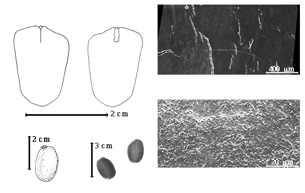 Seed: 19–22 mm long; 13–16 mm wide; 4–5 mm thick; not overgrown; not angular; symmetrical; oblong; compressed; with surface smooth; without visible radicle and cotyledon lobes; without hilar sinus; without umbo on seed faces; without medial ridge on each face. Cuticle not exfoliating; not inflated; not wrinkled. Testa present; without pieces of adhering epicarp; not adhering to endocarp; free from endocarp; glossy; not modified by a bloom; colored; monochrome; brown (usually darker along margins and yellowish brown on faces); glabrous; smooth; osseous. Pleurogram absent. Pseudopleurogram present; 100 %. Fracture lines present; concentric. Rim absent. Wing(s) absent. Raphe visible (upon removal of cuticle a whitish raphe is visible from hilum to base of seed). Hilum present; fully concealed; concealed by aril; without faboid split; punctiform; subapical to radicle tip; flush (in depression); not within corona, halo, or rim. Lens not discernible. Endosperm absent. Cotyledons smooth; both outer faces convex; both the same thickness; both more or less of equal length; not folded; margin entire 180 degrees from base of radicle; similar at apex; partially concealing radicle (only tip exposed); split over radicle and notched at radicle; with the interface division terminating at base of radicle; without margins recessed; inner face flat; glabrous on inner face. Embryonic axis straight; parallel to length of seed; without a joint evident between the radicle and the cotyledons. Radicle differentiated from cotyledon; centered between cotyledons. Plumule rudimentary; glabrous.